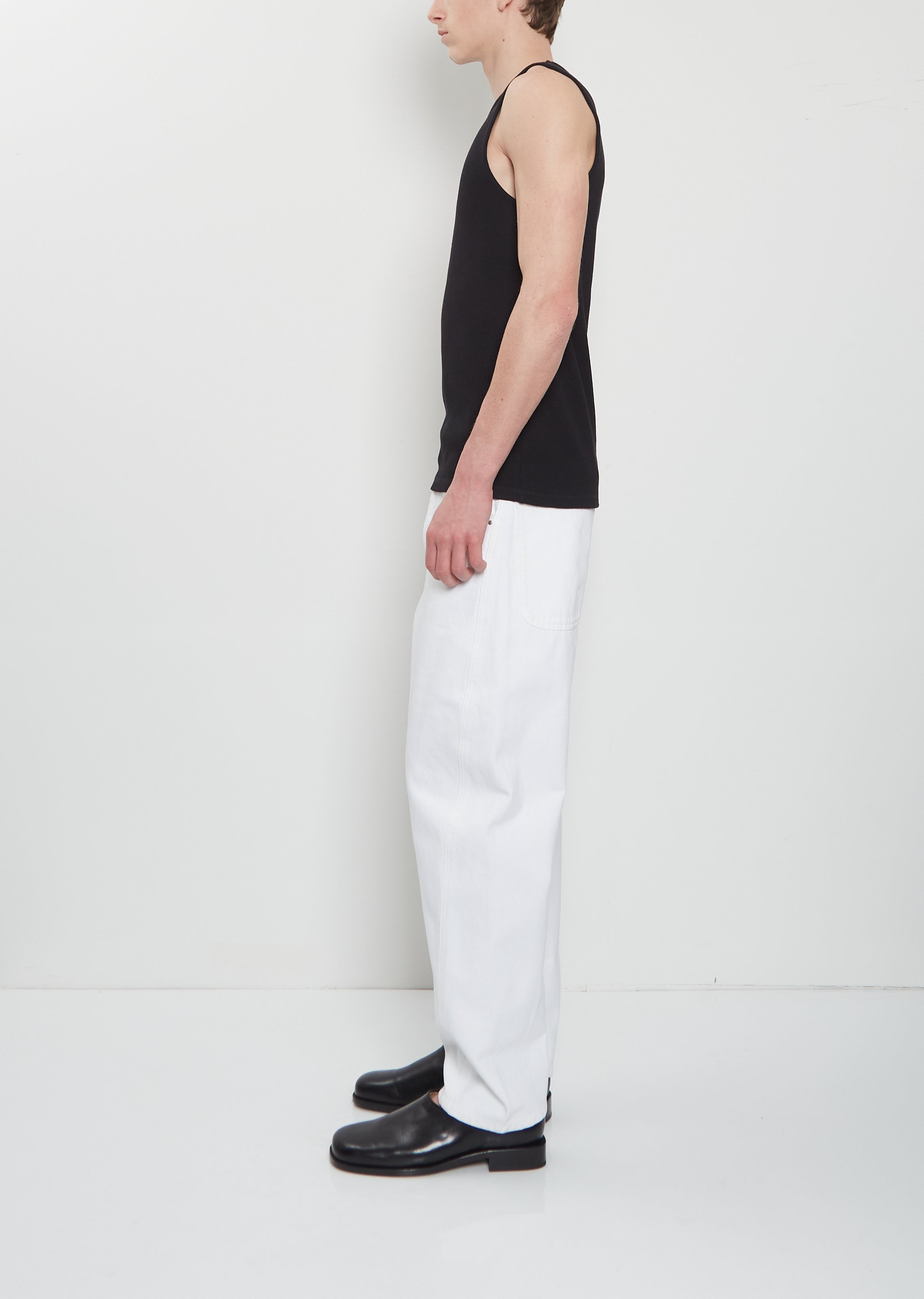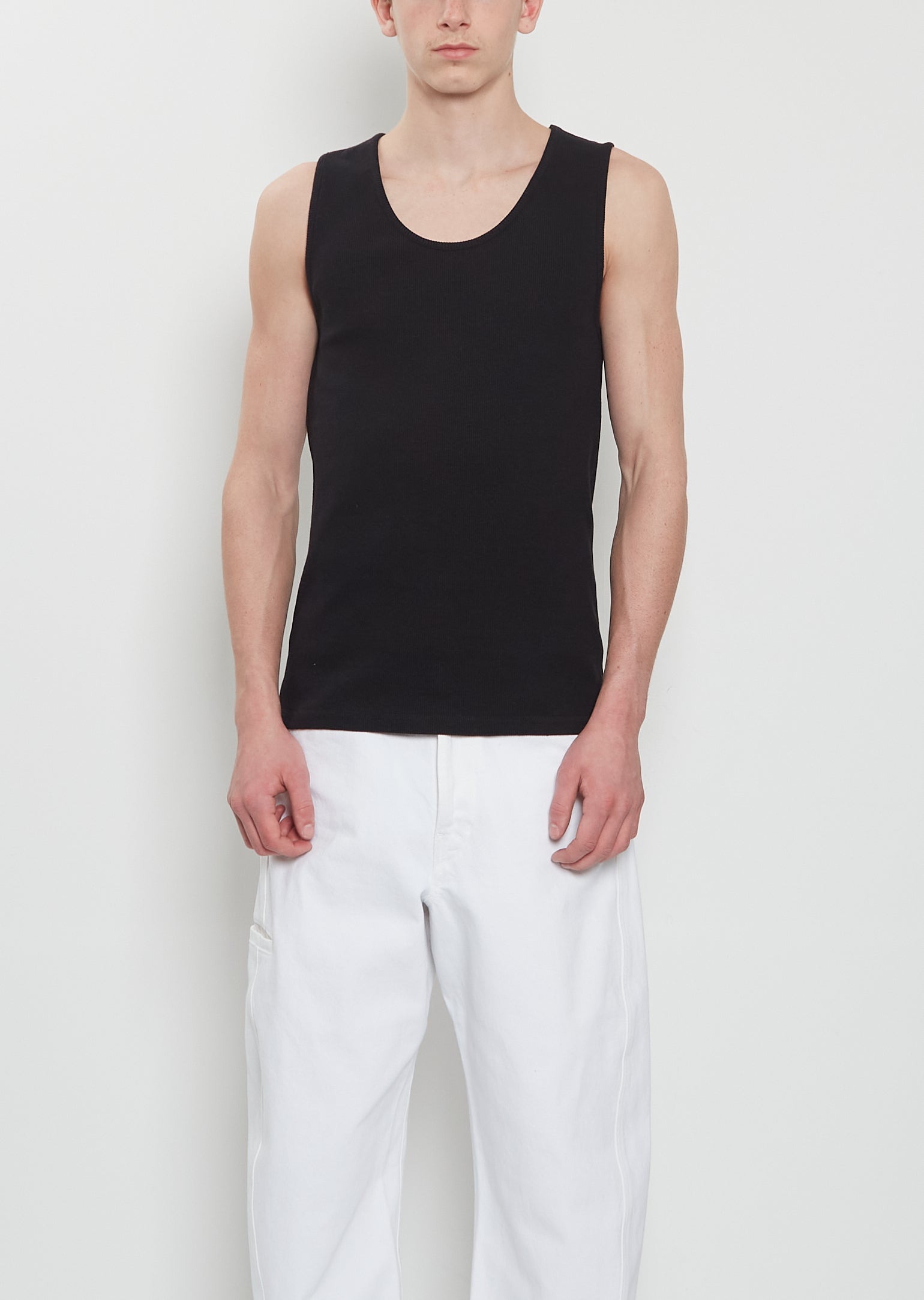 Lemaire black tank top with a rounded neckline crafted from soft and breathable stretch ribbed cotton and linen jersey. Closer fit.