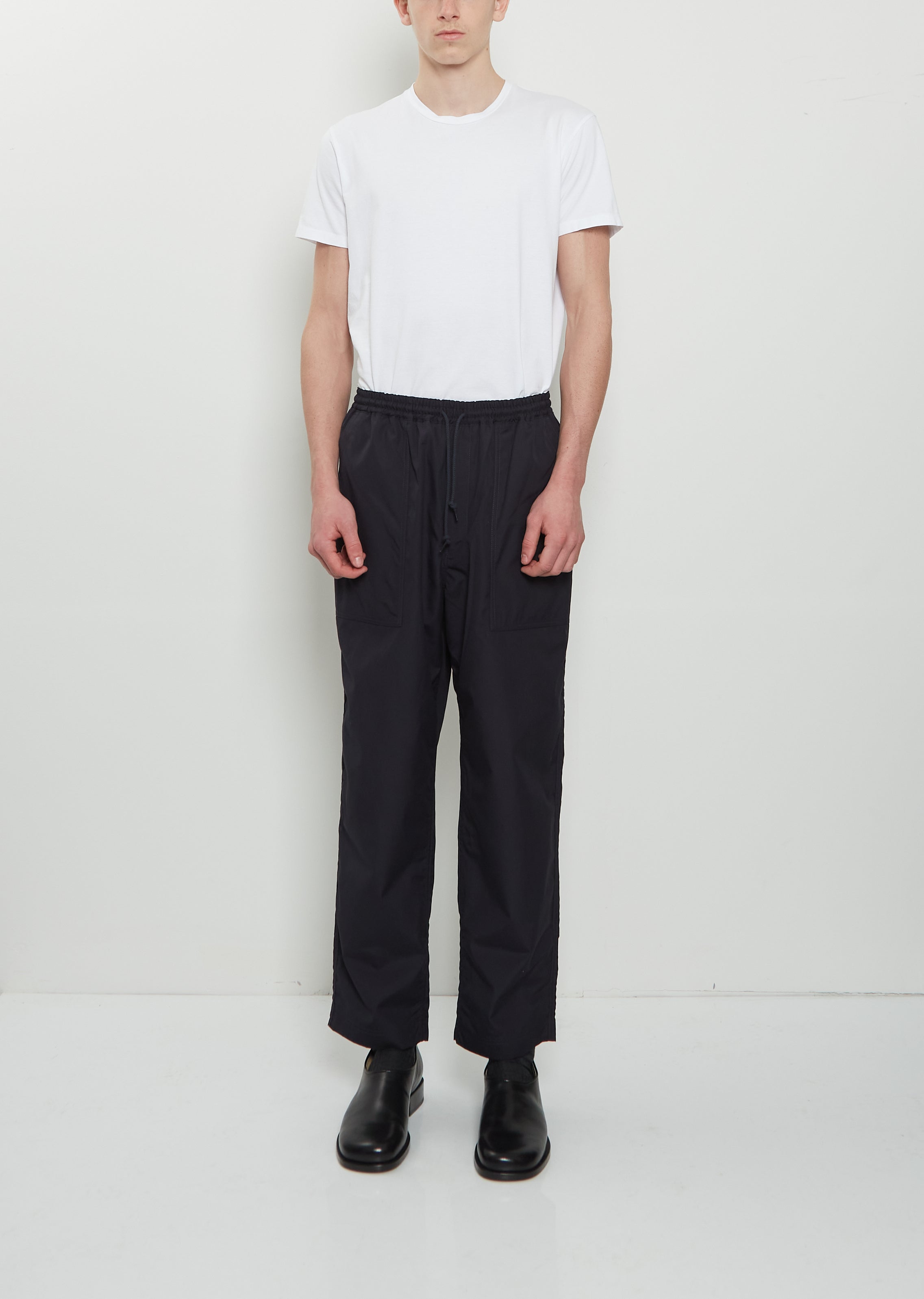 Comme des Garçons Homme navy pant with slightly tapered legs and an elasticated drawstring waist in crisp cotton. Features angled pockets and patch pockets at back. Relaxed fit.