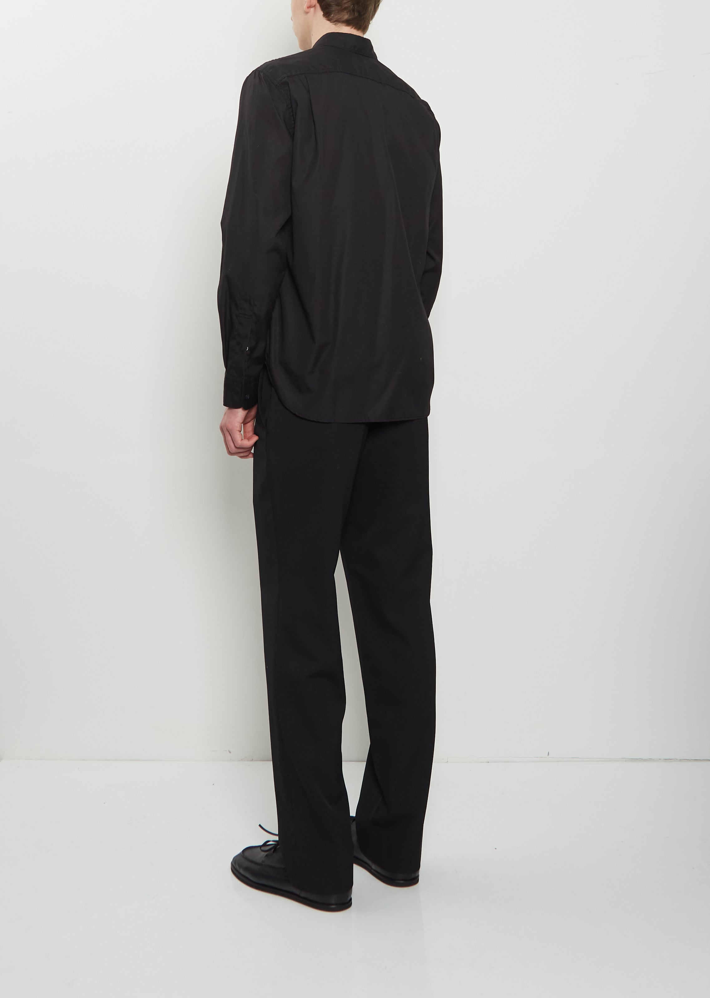 Comme des Garçons Homme black long sleeve shirt with a classic collar and a single patch pocket at front in soft cotton. Features buttoned cuffs, an elongated curved shirttail and shell-hued buttons closure at front.