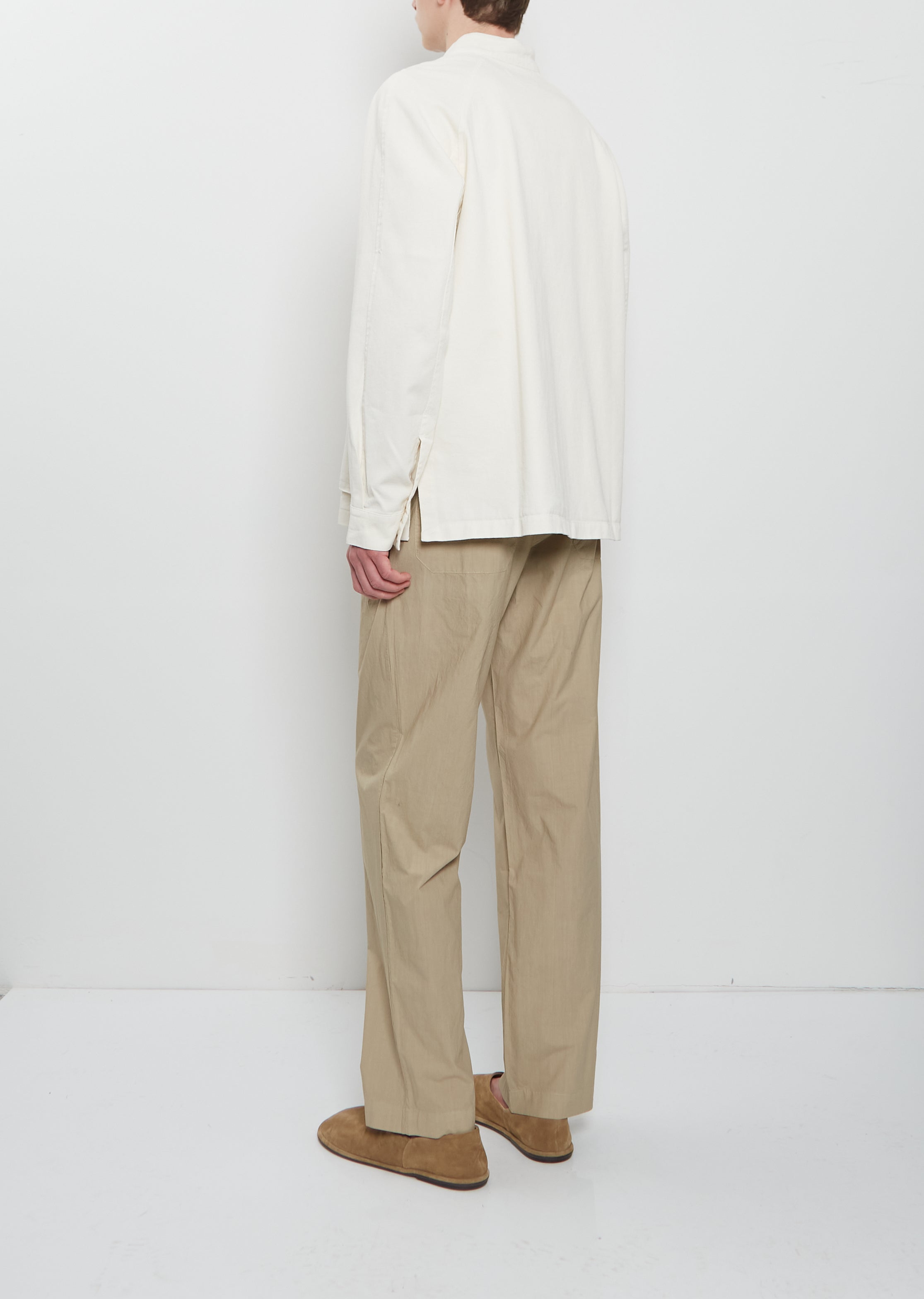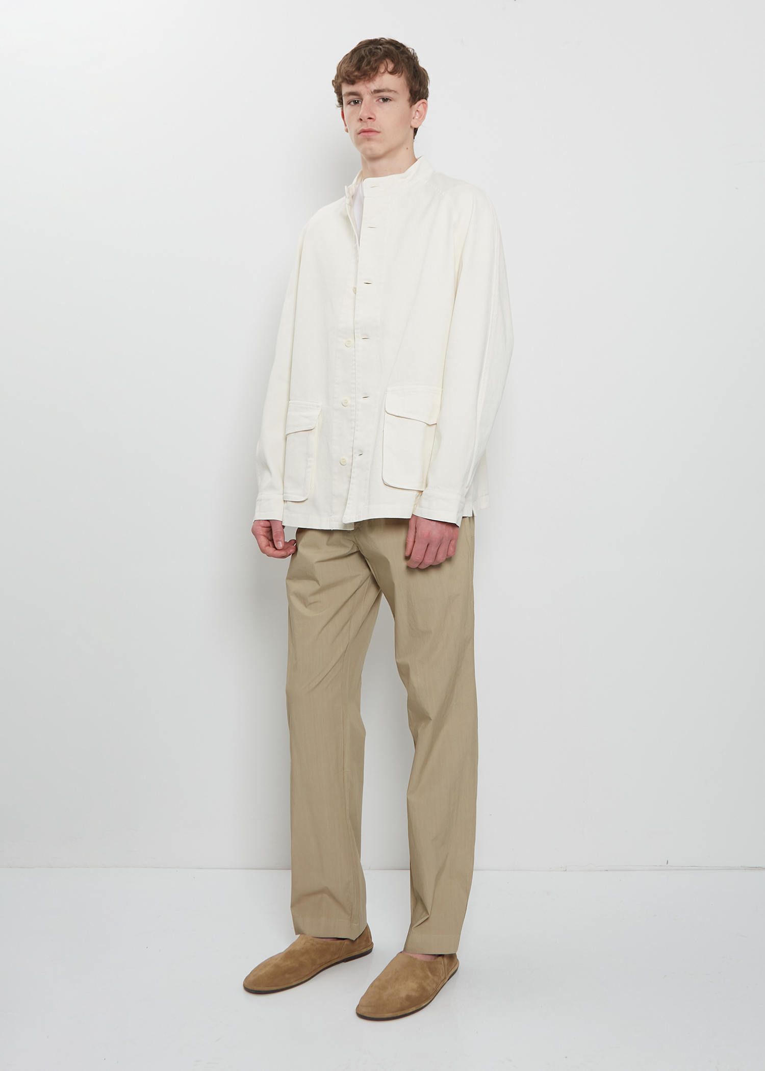 Labo.Art white jacket with a stand collar and front flap patch pockets in cotton. Features raglan long sleeves, buttoned cuffs and a tonal button front closure. Relaxed fit.