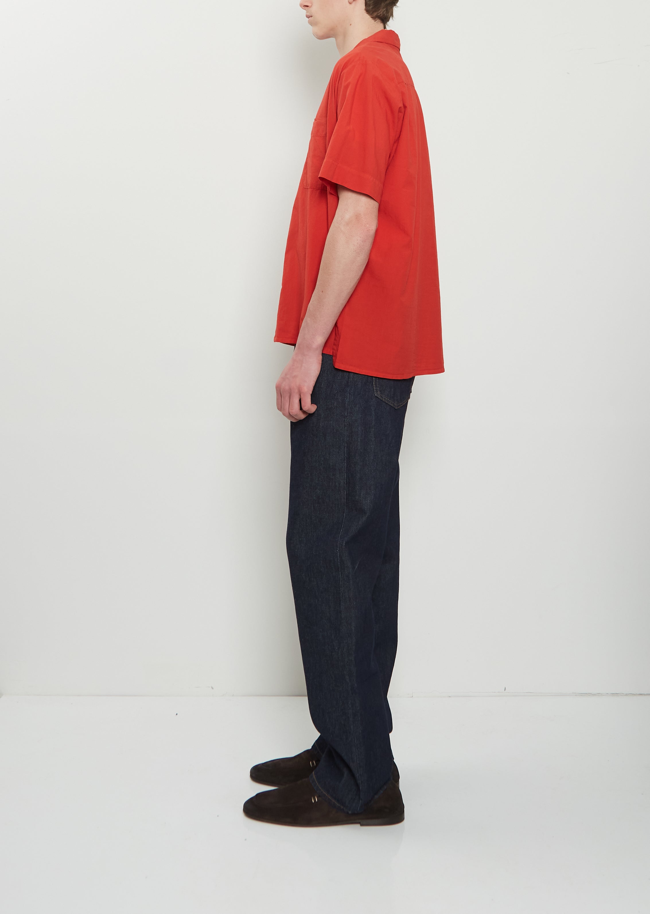 Labo.Art red short sleeve shirt with a notched collar and a singled patch pocket at chest in lightweight cotton muslin. Features side slits, back yoke and tonal buttons closure. Boxy fit.