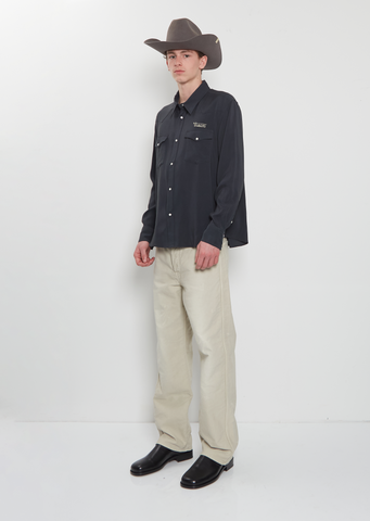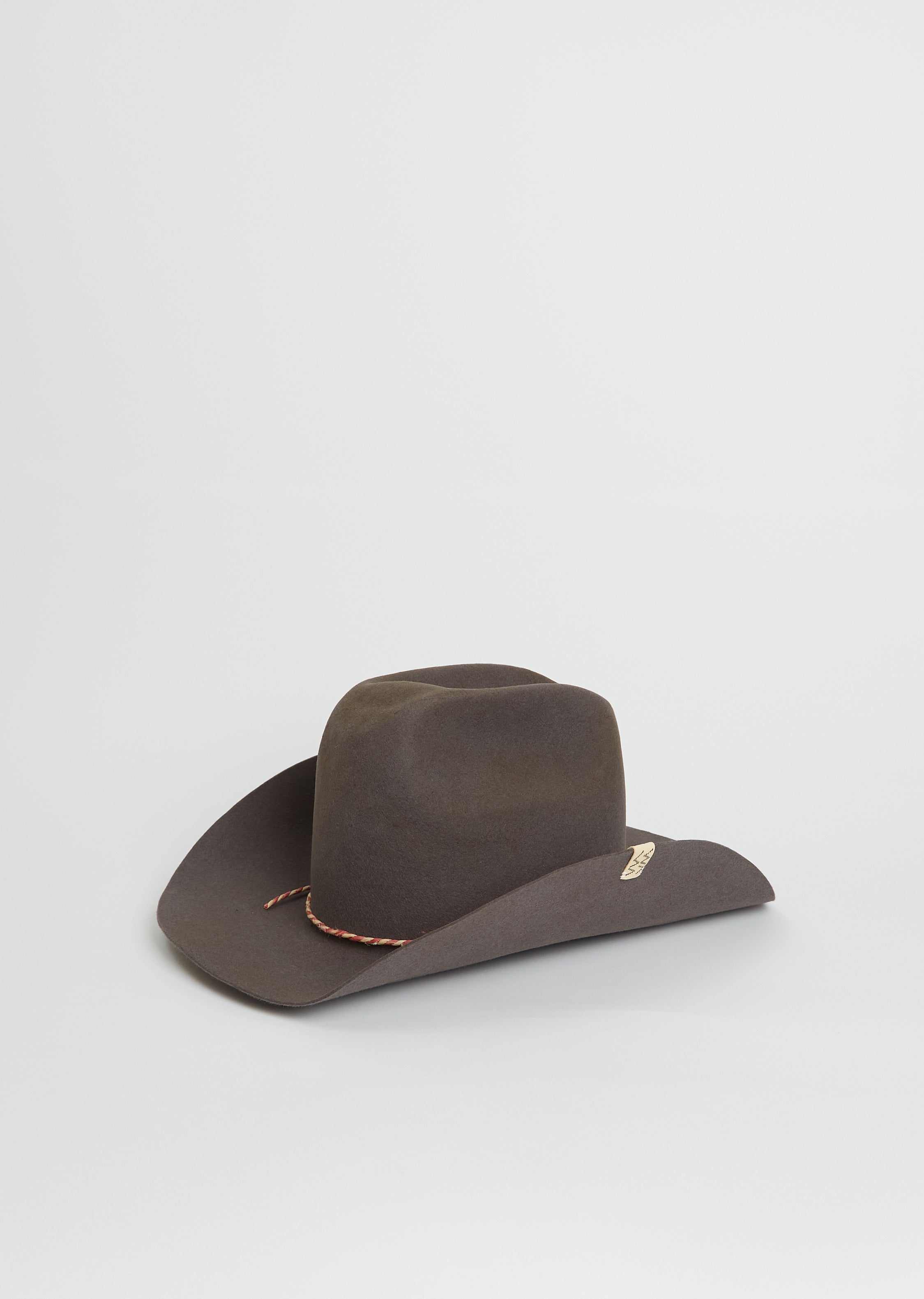 Visvim grey cowboy hat in felted rabbit fur with a distressed finish throughout. Detailed with a ramie rope band and curved brim.