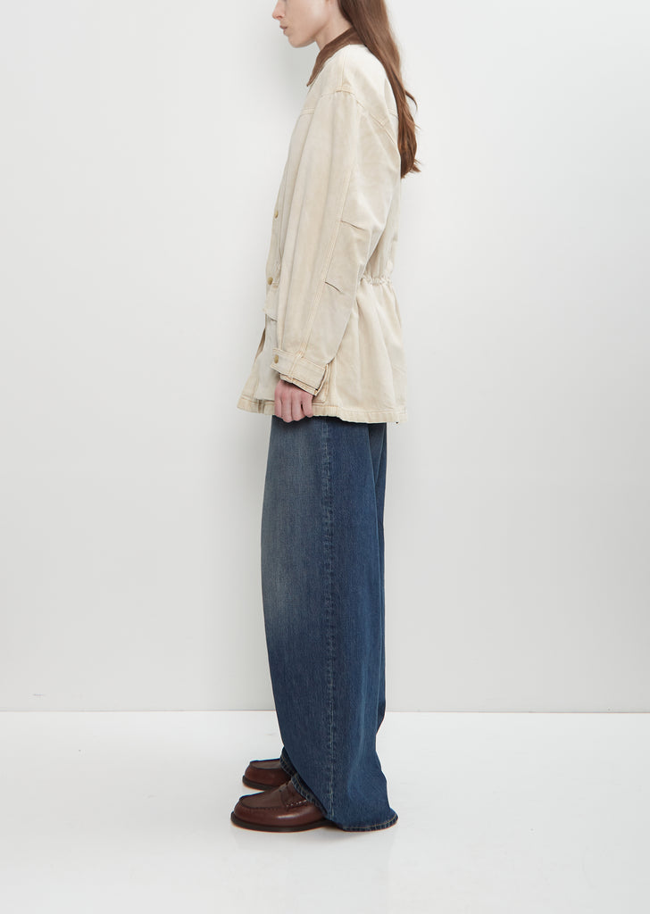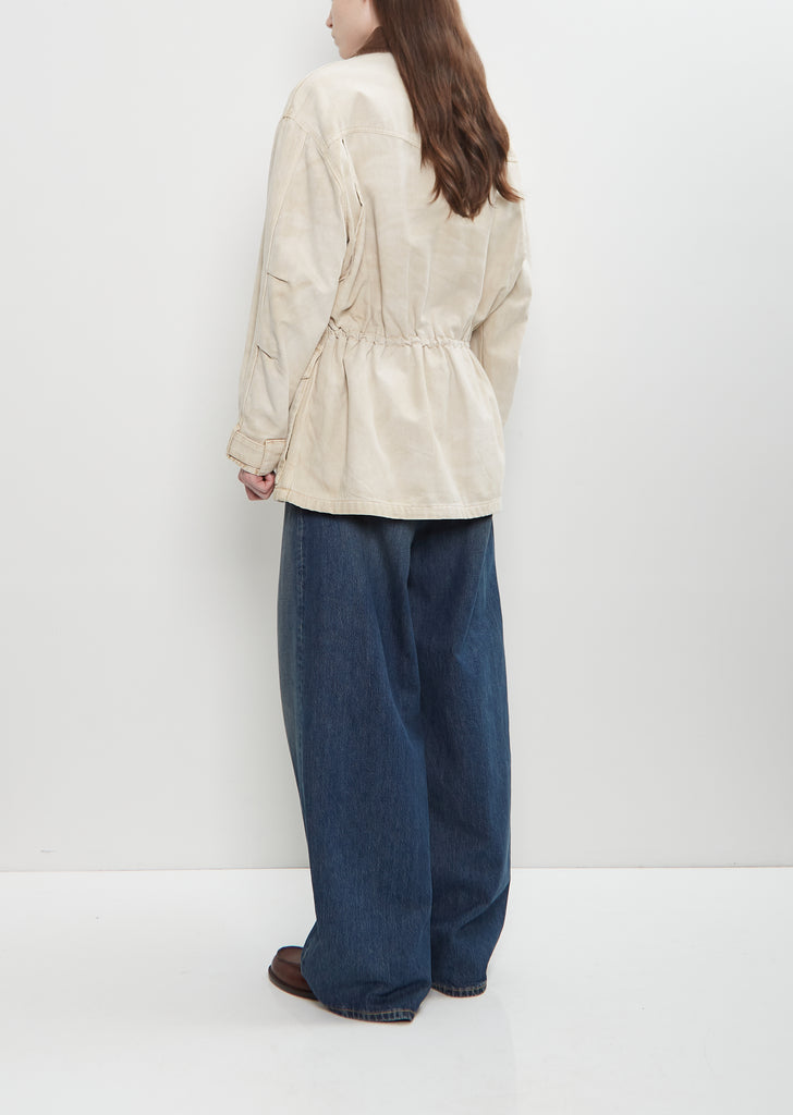 6397 tea stain beige barn jacket with a contrasting brown corduroy collar and elasticated drawcord waist in cotton denim. Features dropped shoulders, adjustable press button cuffs, press button flap patch pockets with side opening, an interior zippered pocket, an interior press button pocket, and a concealed double zipper press button placket. Finished with branded gold-toned hardware throughout. Lined in tonal gradient plaid flannel.