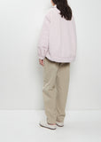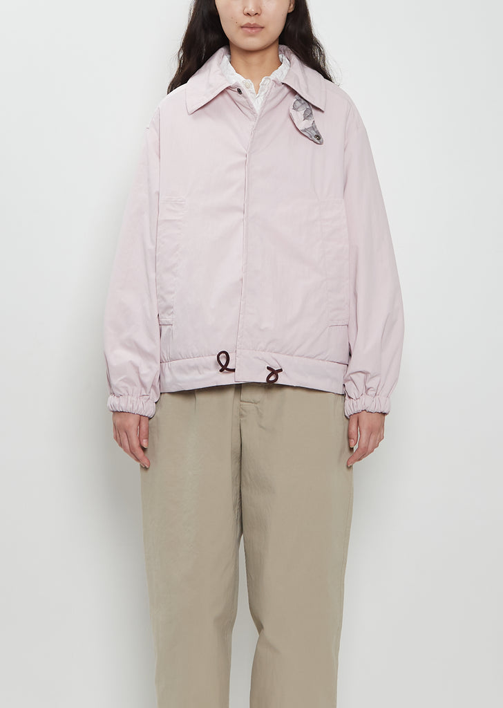 La Garçonne x Konrad Exclusive — blush pink reversible padded jacket made from a light quilted cotton and recycled polyamide blend with a floral pattern on reverse side. Features a classic collar, buttoned tab at neck, angled front pockets, elasticated cuffs, adjustable drawstring hem, and a concealed press button front. Padding crafted in recycled cashmere and polyamide blend.