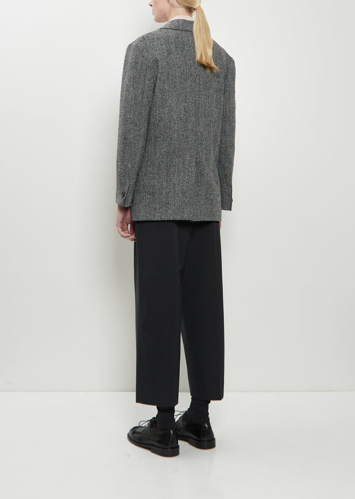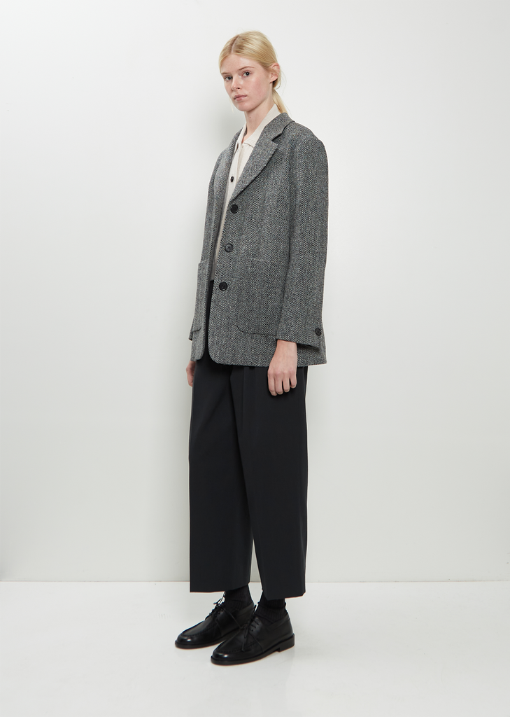 Margaret Howell grey and black herringbone jacket with a convertible notched collar and three button closure in Harris tweed. Features dropped shoulders, large front patch pockets, buttoned cuffs, vent at back, and an interior slip pocket. Fully lined in black cotton viscose fabric. Relaxed fit.