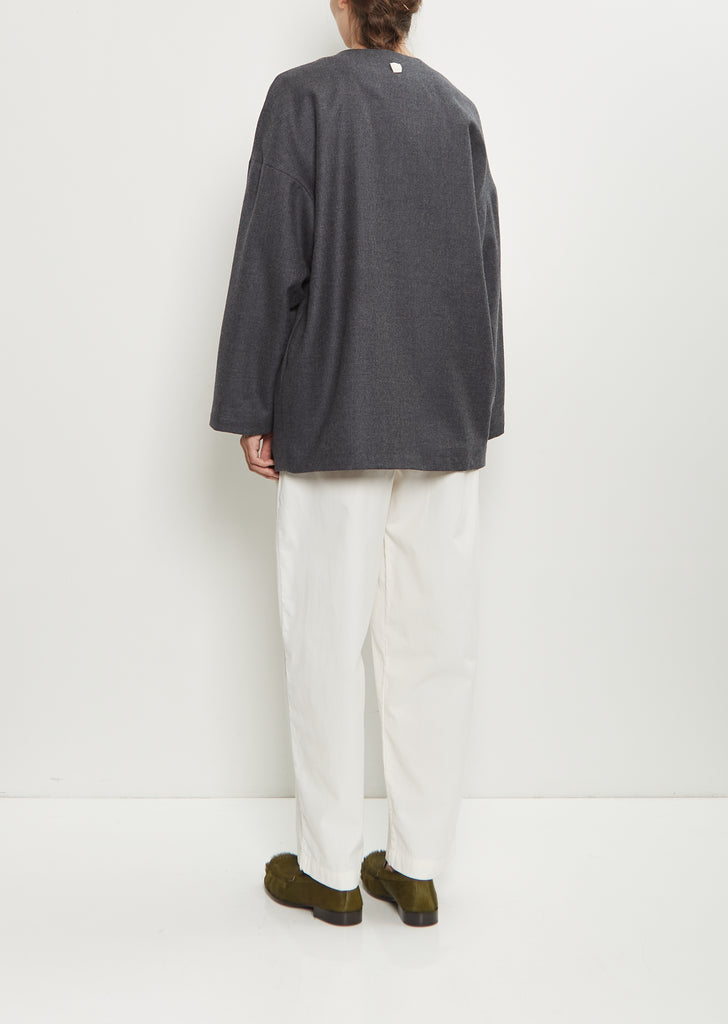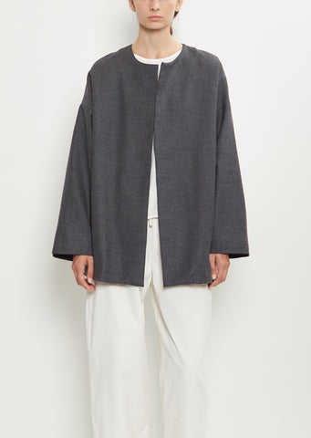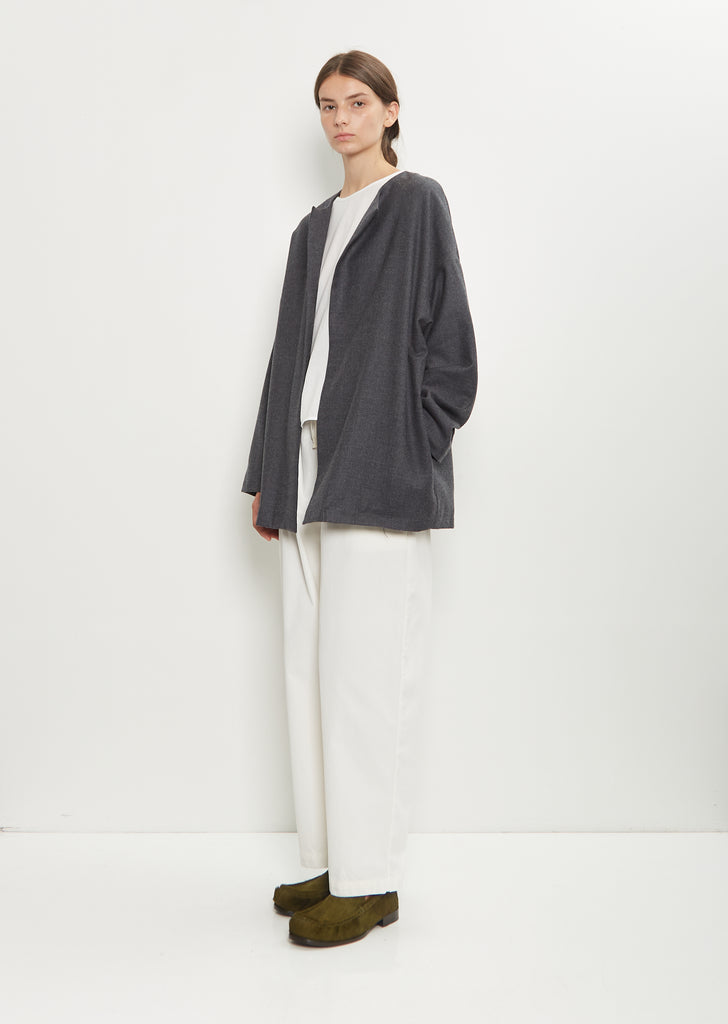 Nitto grey open front jacket with a round neckline in a lightweight and soft Italian wool gabardine. Features dropped shoulders, side seam pockets, and signature embroidered detail at back neck. Lined in tonal wool flannel.