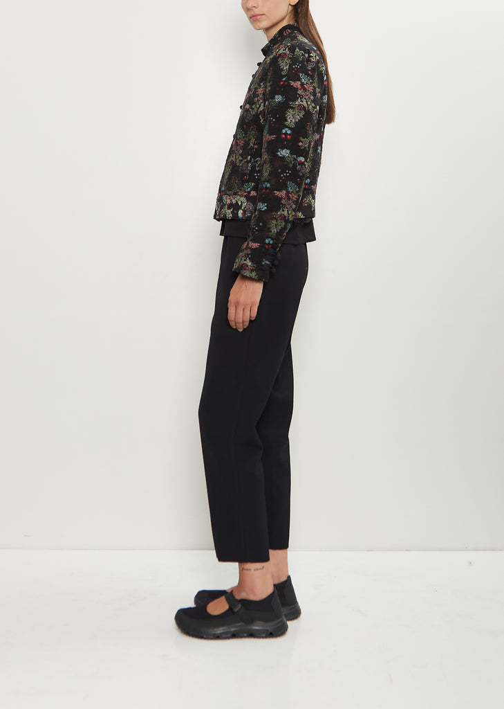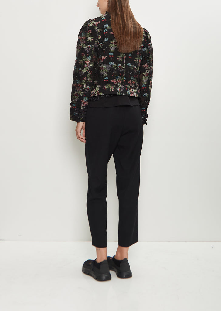 Noir by Kei Ninomiya black jacket with a band collar and an asymmetrical knot button closure in a semi-sheer floral jacquard. Features a press button fastening at neck, set-in sleeves, vertical front welt pockets, and knot button cuffs. Half lined in tonal organza.