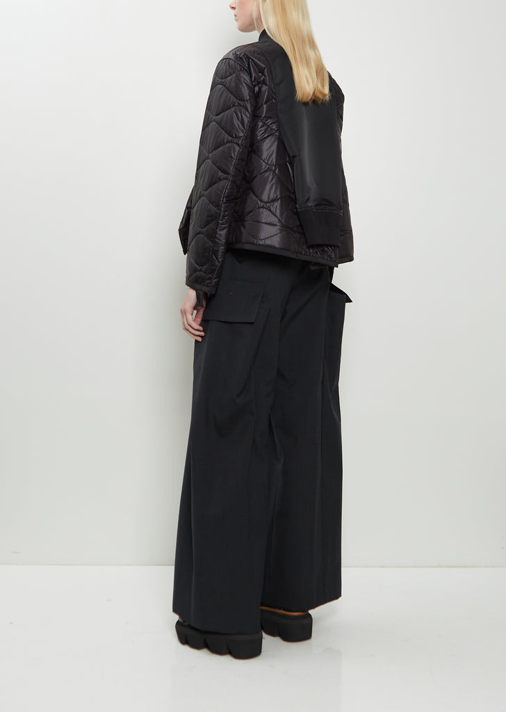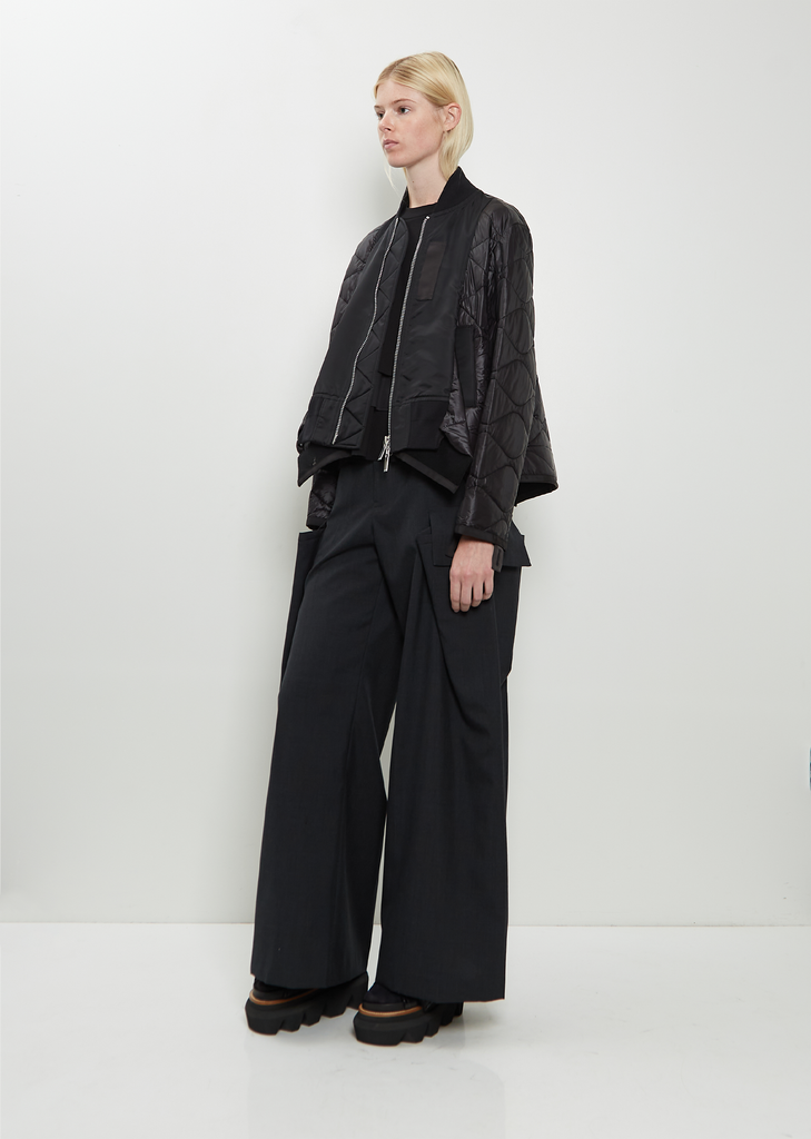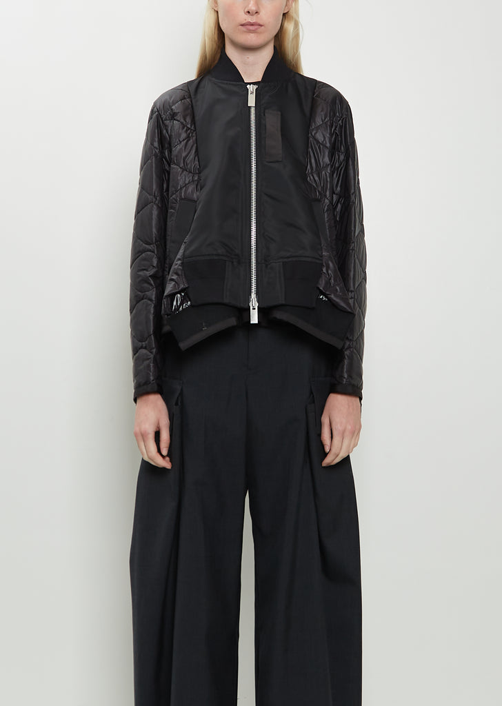 Sacai black voluminous blouson with solid black center panels and quilted sides in nylon twill. Features a bomber style collar, grosgrain detail at chest, vertical press button welt pockets, buttonless tab details at cuffs, ribbed trim finish at neckline and center panel hems, grosgrain trim finish at cuffs and side panel hems, and a double zip front closure. Finished with silver-toned branded hardware throughout. Comes unlined.