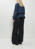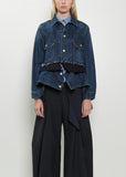 Sacai blue denim jacket with a tiered wool melton and denim underlay at hem in cotton denim. Features a classic collar, action pleats at placket, button flap front pockets, buttoned cuffs, split side seam details at tiers, two box pleats at back yoke, and raw edge finishing at main hem. Finished with silver-toned branded buttons throughout.
