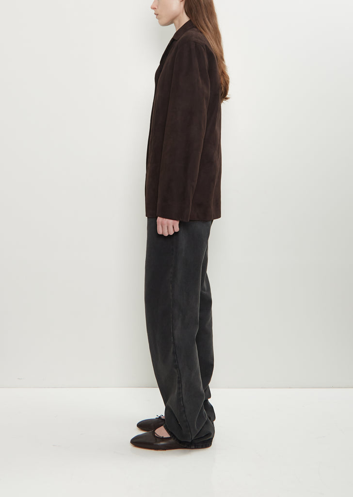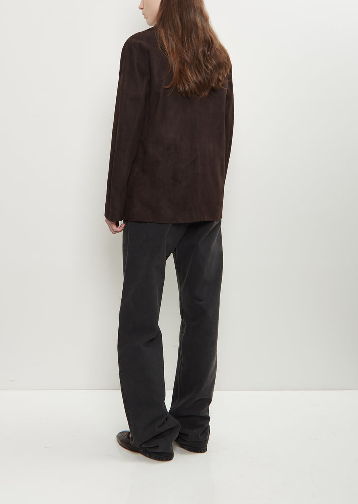 The Row dark brown single-breasted jacket with a notched lapel and horn-hued button front in soft, lightweight suede. Features side seam pockets and an interior buttoned welt pocket. Lined in tonal silk.