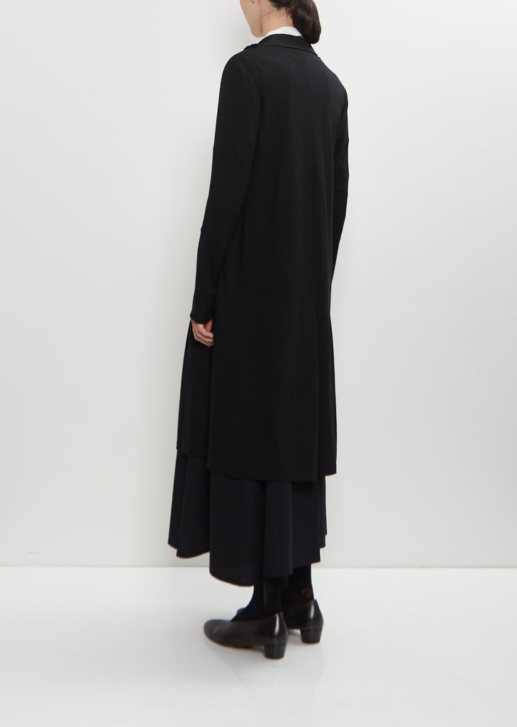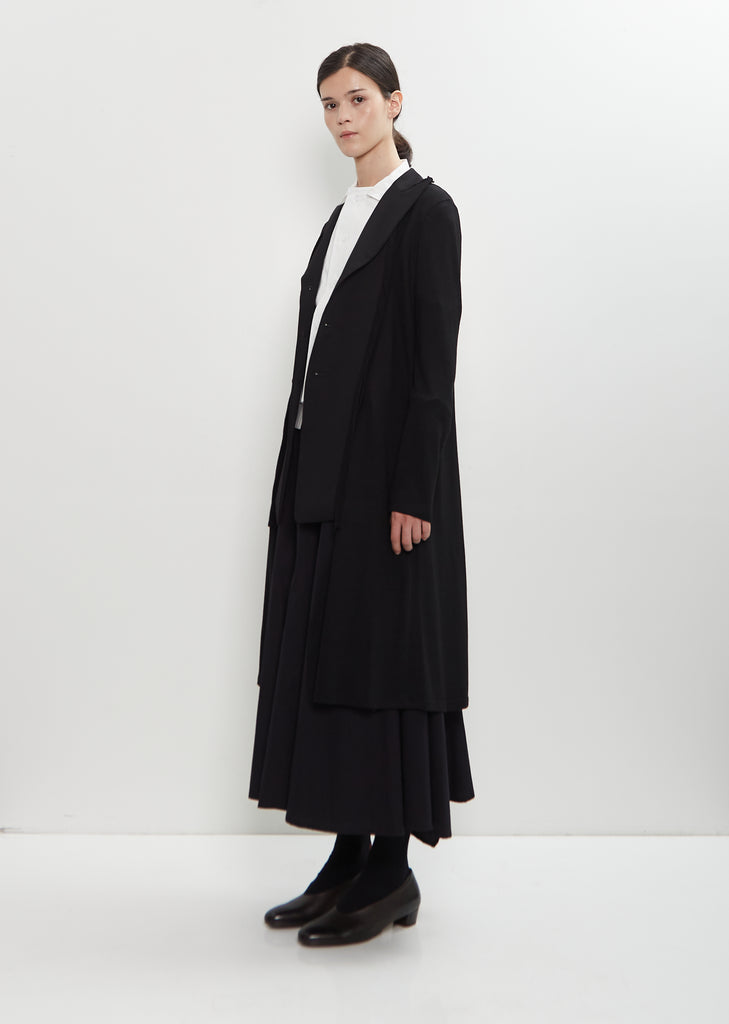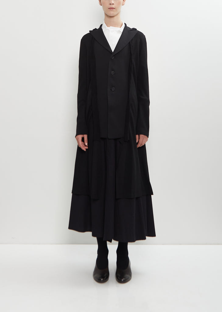 Yohji Yamamoto black long combination jacket with peak notched lapels and horn-hued button front in laine wool twill and knit. Features set-in sleeves, draped knit details along jacket center, and a box pleat at back center seam.