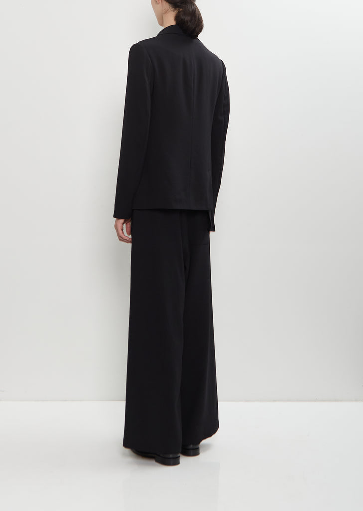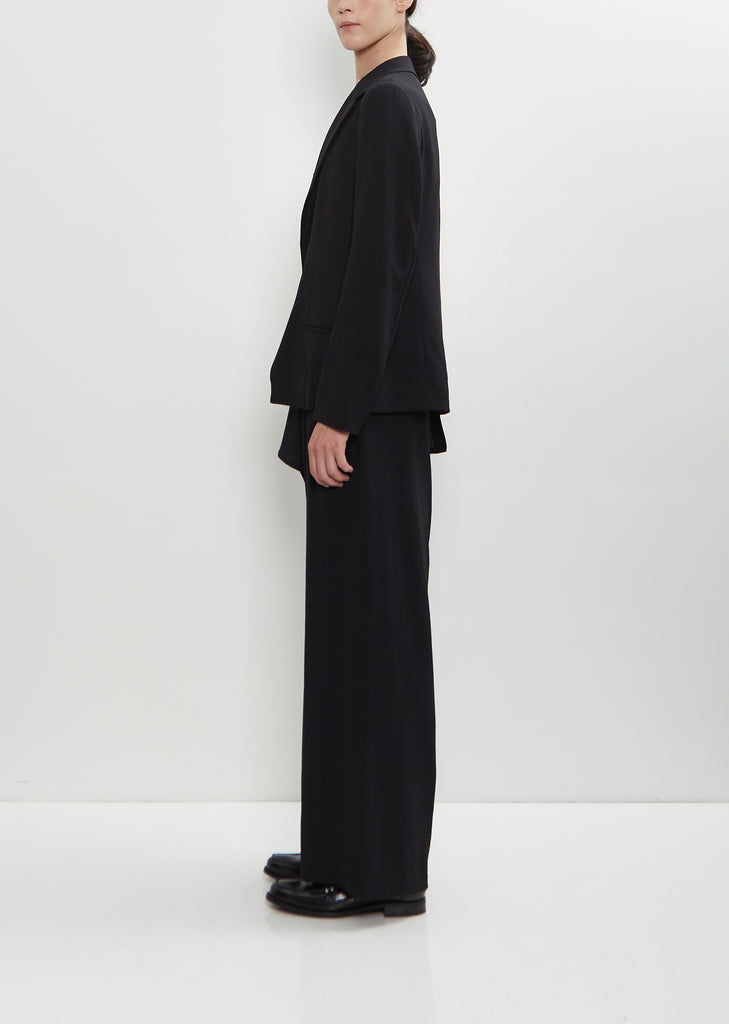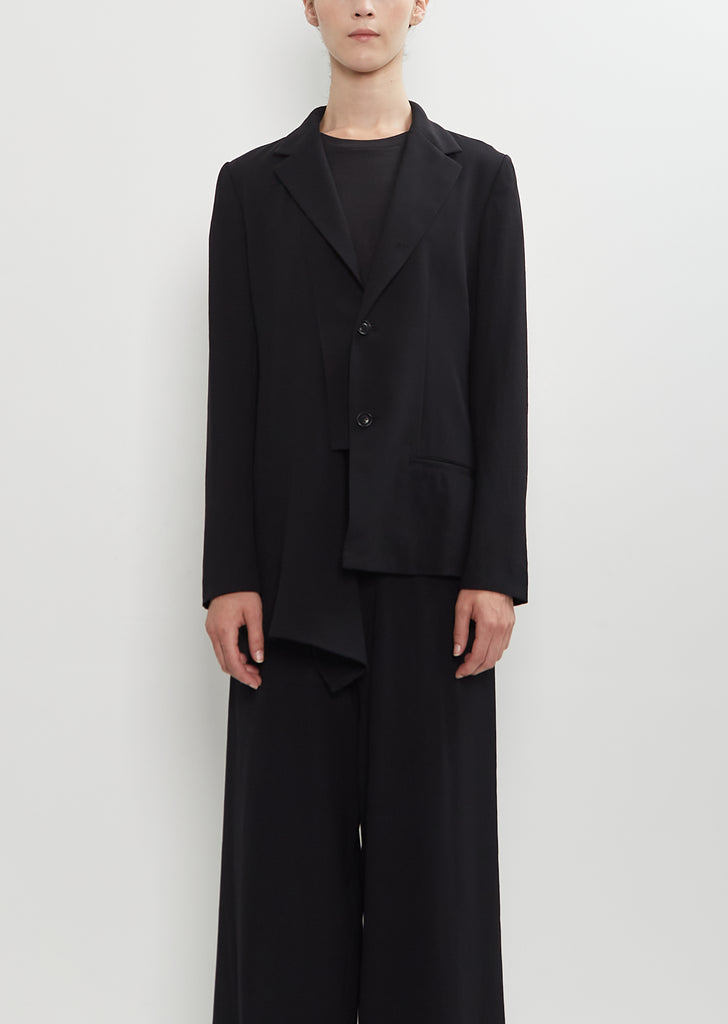 Y's black asymmetrical drape jacket with a notched collar and two tonal button front in laine wool twill. Features set-in sleeves, a front welt pocket, and asymmetrical vent at back. Lined in tonal cupro.