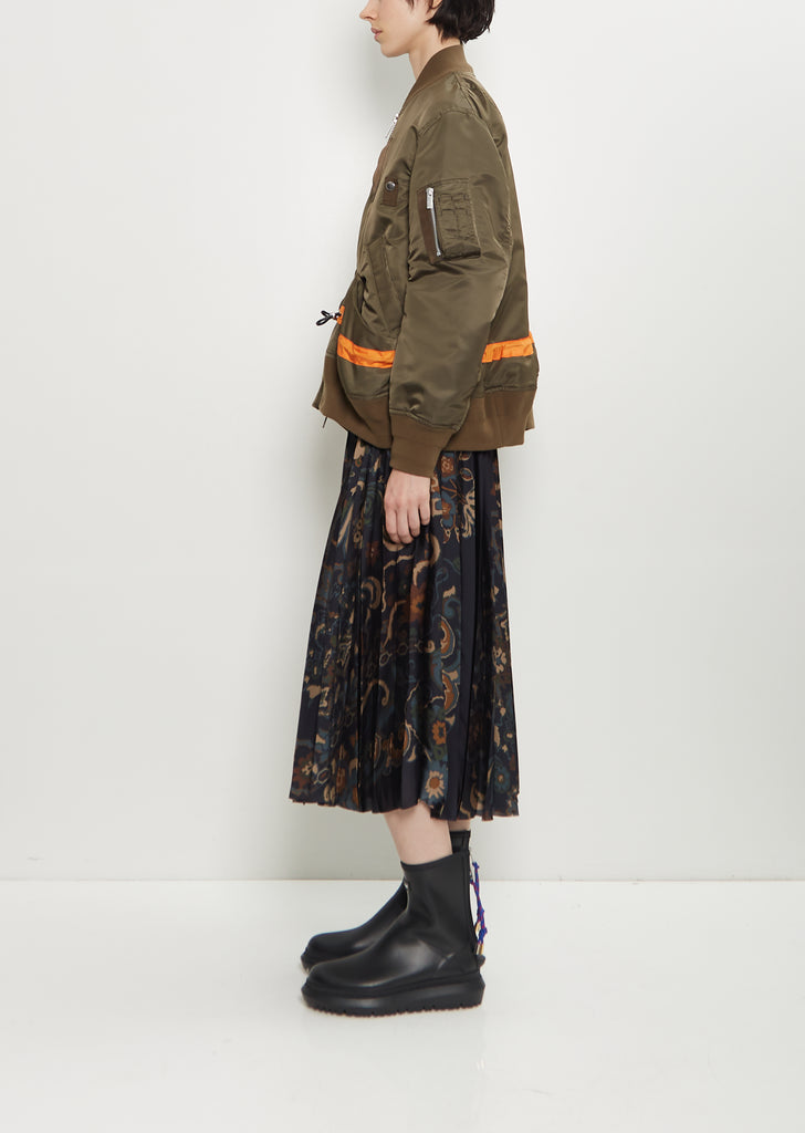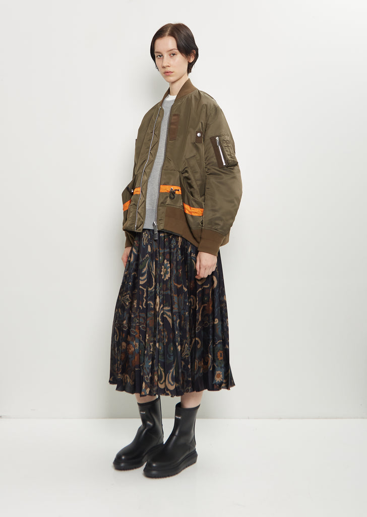 Sacai dark khaki jacket with a bomber style rib knit collar and double zip closure in technical nylon twill. Features grosgrain details, zippered pocket at left sleeve, angled press button pockets, exaggerated slip pockets, orange detailed drawcord waist, and ribbed trim finish at neckline, cuffs, and hem. Finished with silver-toned branded hardware throughout. Lined in orange cupro.