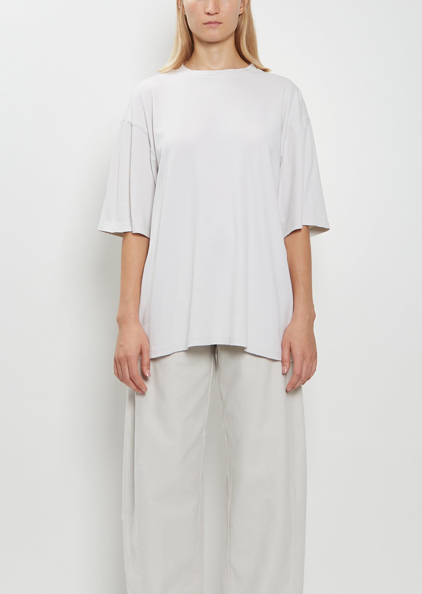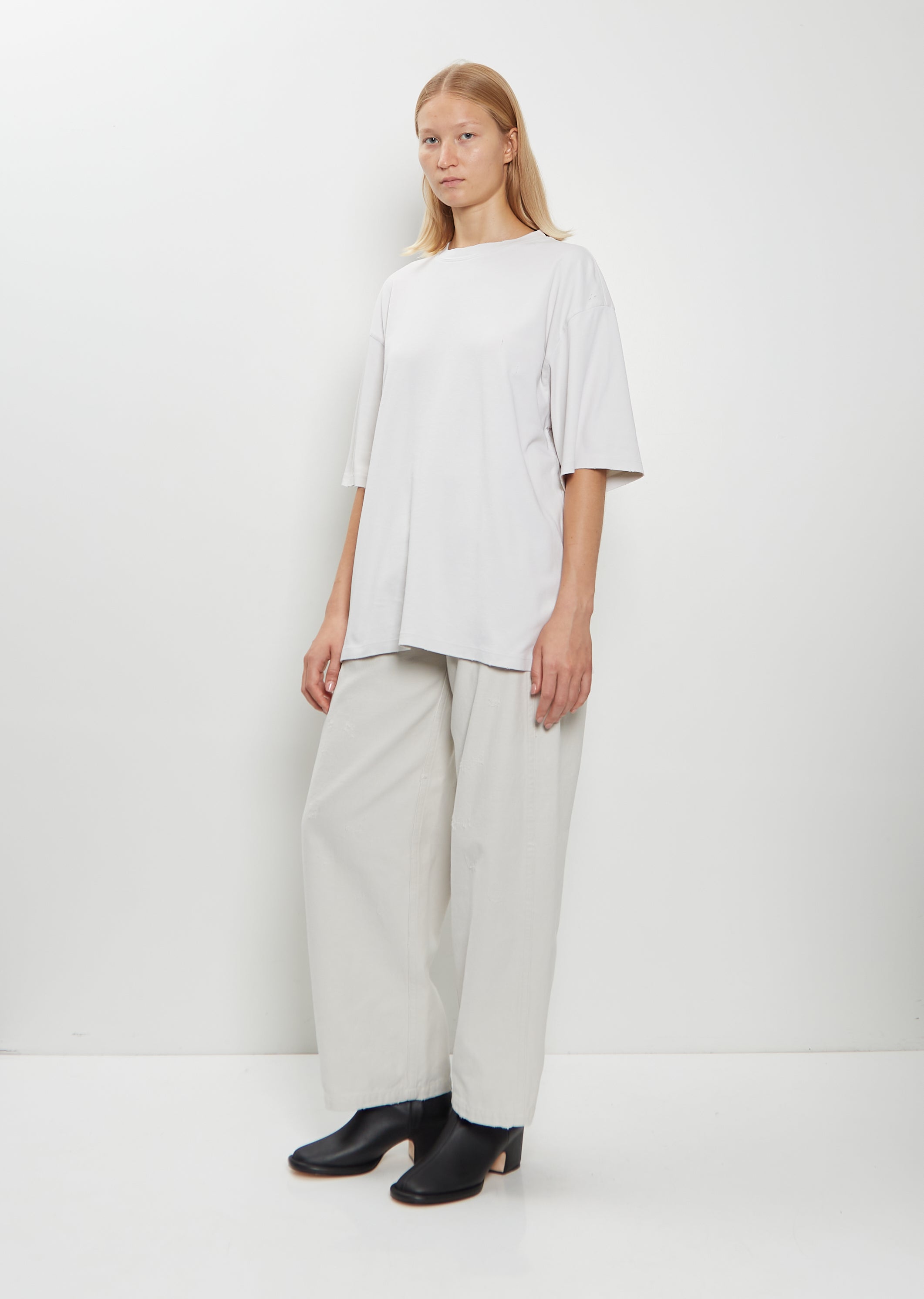 Lauren Manoogian washed chalk oversized tee with a crew neckline and subtle distressed details throughout in soft and dense pima cotton jersey. Features dropped shoulders and a straight hem. Relaxed fit.