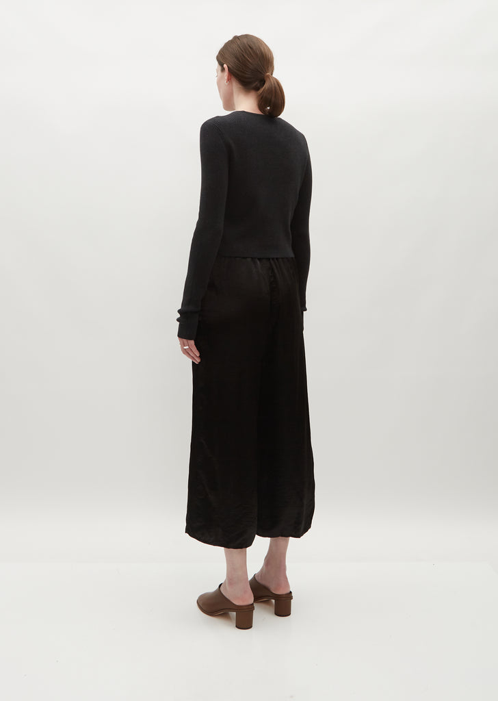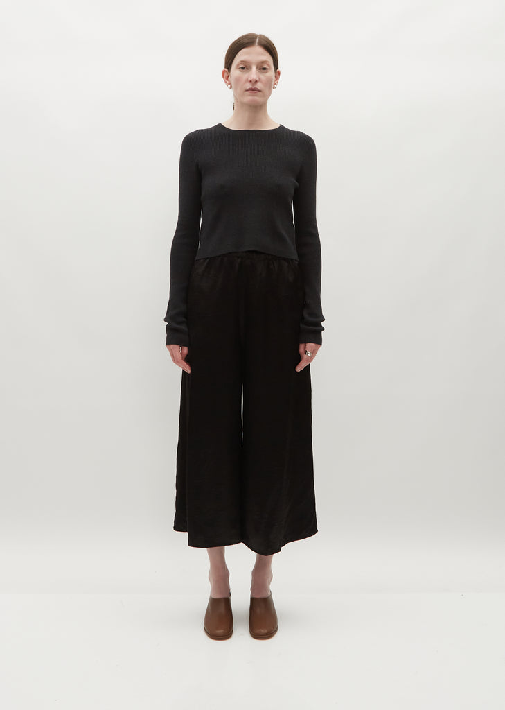 Lauren Manoogian black trouser with cropped, wide legs in lightweight soft sheen rayon. Wide silhouette with a relaxed fit.