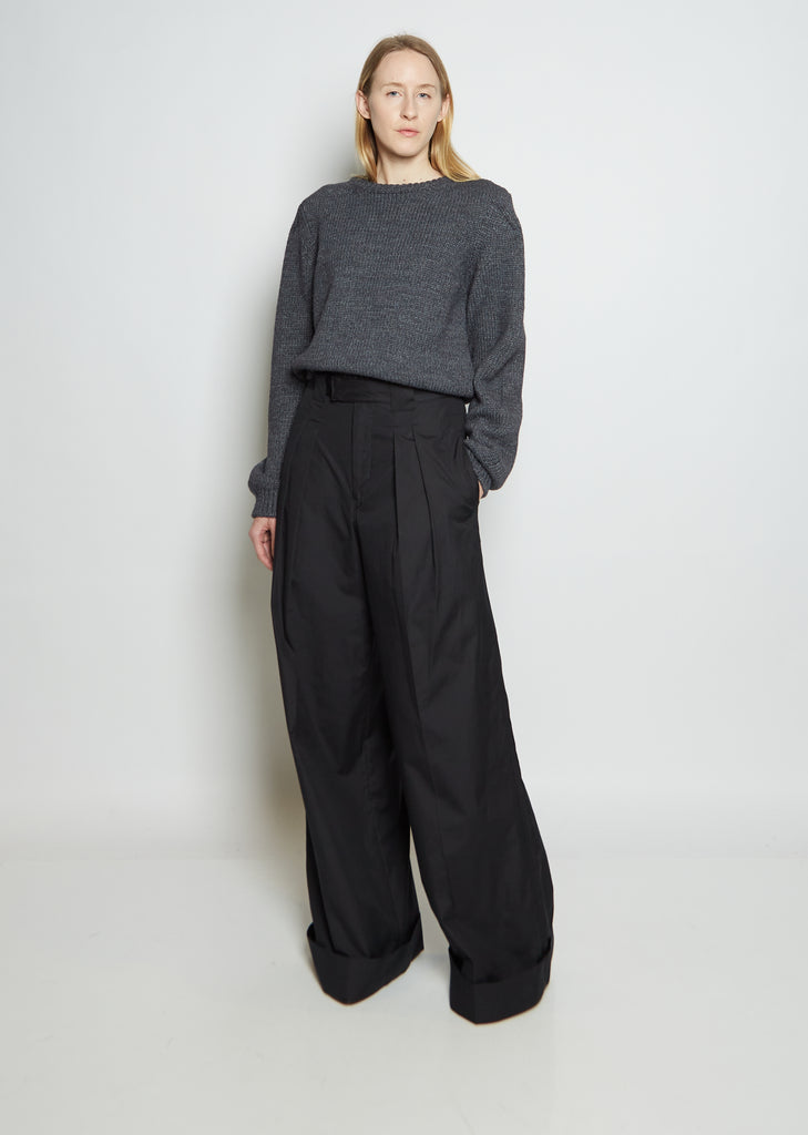 Lemaire black cuffed wide leg trousers with a pleated front in crisp cotton. Features a hook & bar and zip-fly fastening. Wide self belt loops. Concealed in-seam side pockets. Double welt pockets. Relaxed fit.