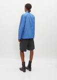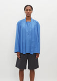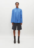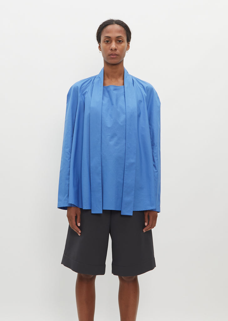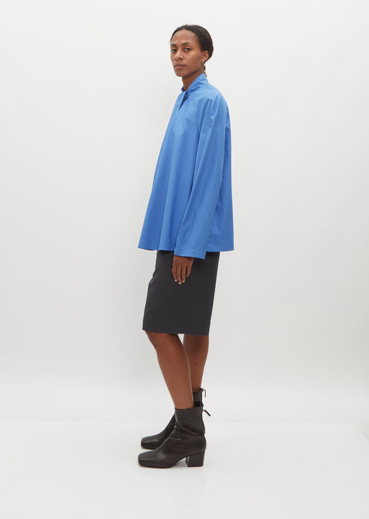 Lemaire cerulean blue blouse with an attached ascout tie in heavy cotton poplin. Features raglan sleeves, a mock neckline with self tie ascout, and an a-line silhouette.