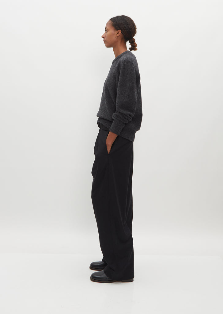 Lemaire dark grey melange crewneck sweater with a 'tilted' shorter front and longer back panel knitted in pure shetland wool. Subtle brand signature blouson-shape silhouette. Finished with a tubular double-rib trim at neckline, and regular rib sleeve cuffs and hem.