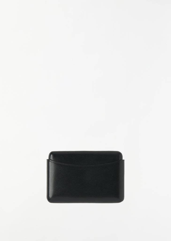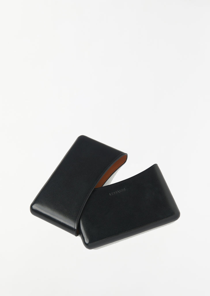 Lemaire card holder crafted in vegetable-tanned leather with a compact and smooth grain. Entirely molded, its curvy shape emerges as the leather is pressed over a metal structure. With a seamless construction, and unlined; each piece is waxed and polished by hand. Two molded shapes which encase smoothly into one another without any added closure system.