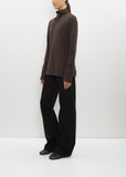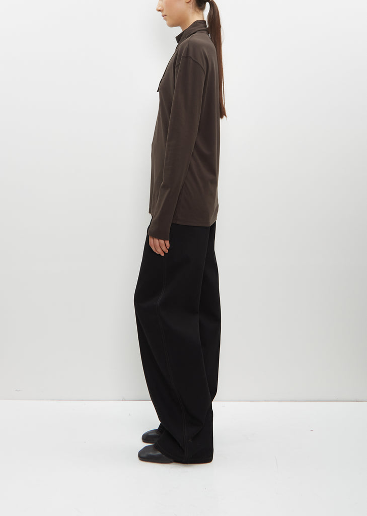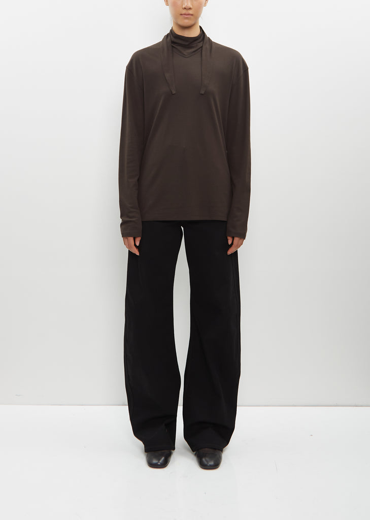 Lemaire dark brown long sleeve top with scarf detail at neck in soft cotton.