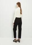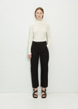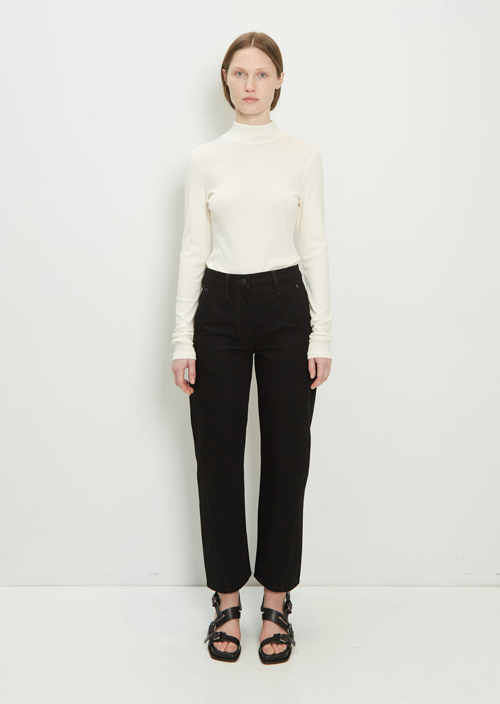Lemaire black signature mid-rise straight leg jeans with twisted seams in cotton denim. Features angled front pockets with rivet-secured edge, and double patch pockets. Zipper with button front fastening. Polished silver hardware. Relaxed fit.