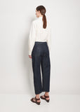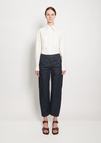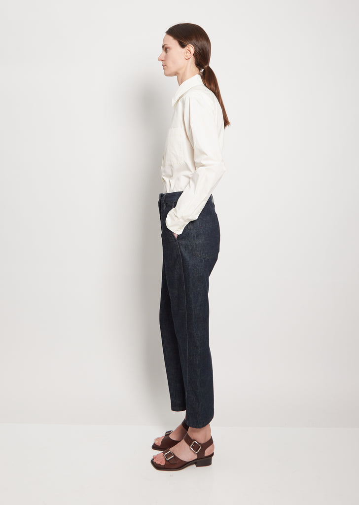 Lemaire signature mid-rise straight leg jeans with twisted seams in indigo cotton denim. Features angled front pockets with rivet-secured edge, and double patch pockets. Zipper with button front fastening. Polished silver hardware. Relaxed fit.