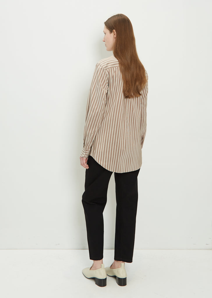 Lemaire fitted shirt with a pointed collar and double chest pockets in chestnut, beige, and white multi stripe cotton and silk. Features a curved shirt tail hem, spread collar, and button front closure.
