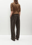Lemaire dark espresso relaxed trouser with tapered legs in a silk blend.Features an elasticated waist, side welt pockets and single patch pockets at back. Easy, pull on fit.