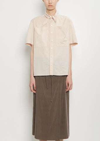 Lemaire dusty rose short sleeve shirt with an attached scarf collar in a lightweight washed cotton poplin with a satin-like texture. Features two large chest patch pockets, gathered details at sleeve seams and back yoke, and a shell-hued button front closure. Relaxed fit.