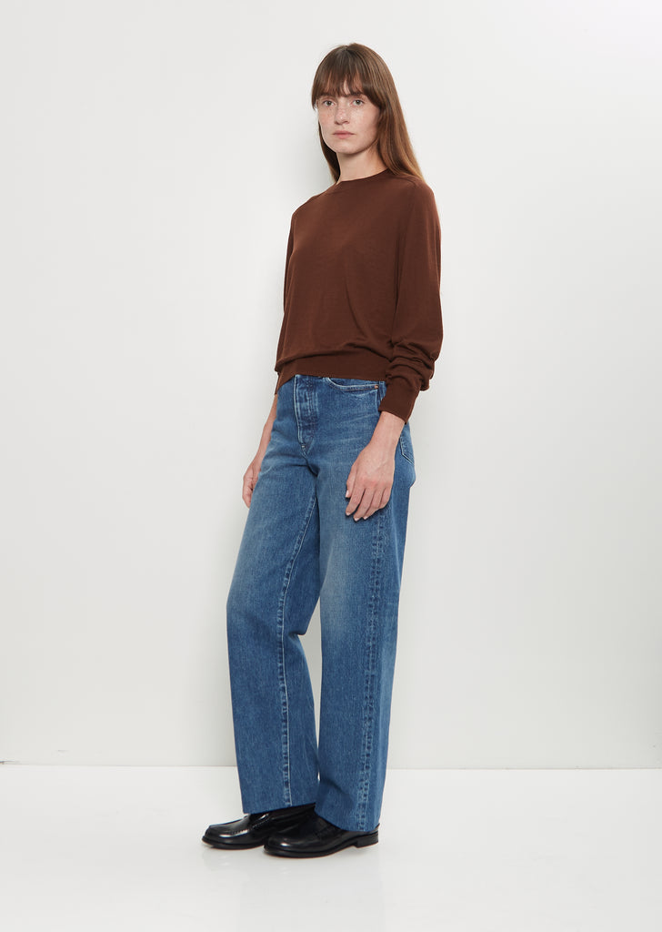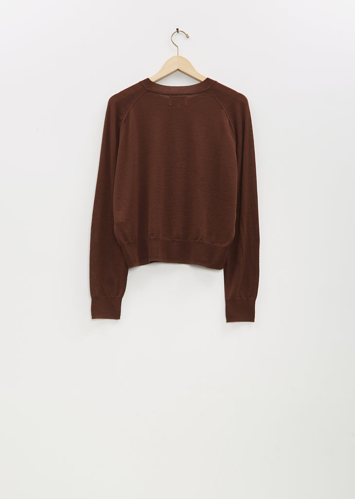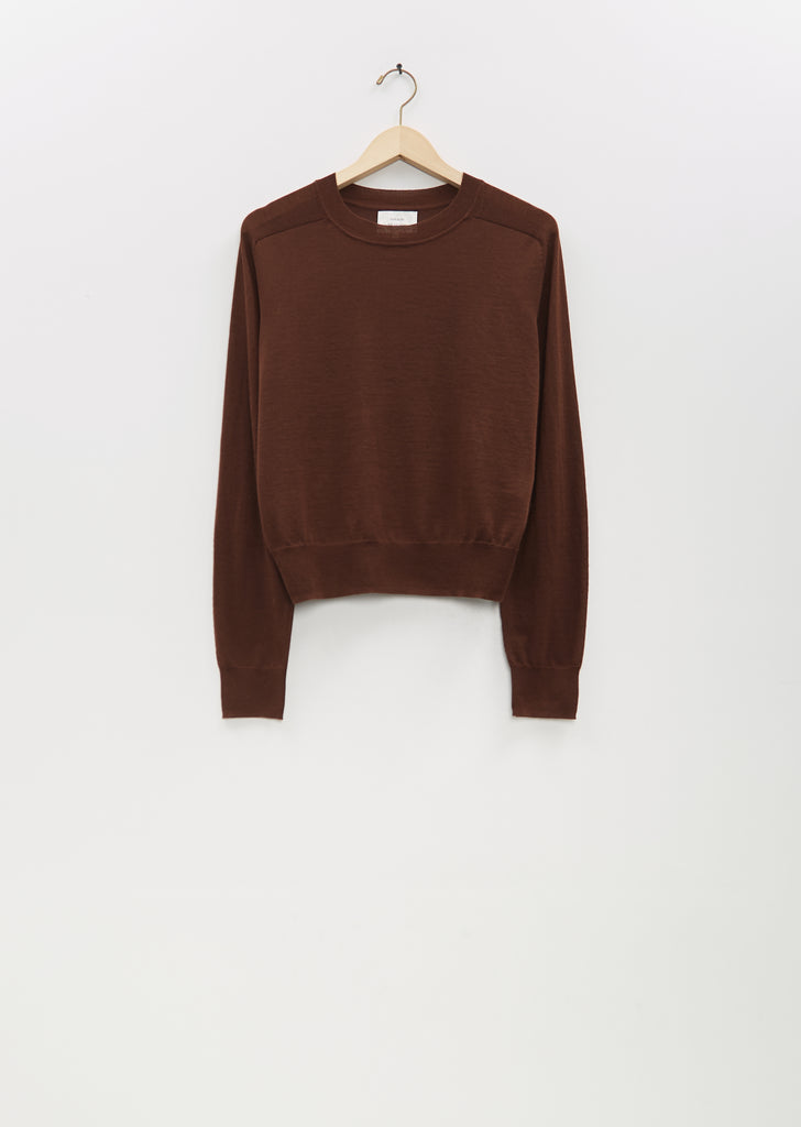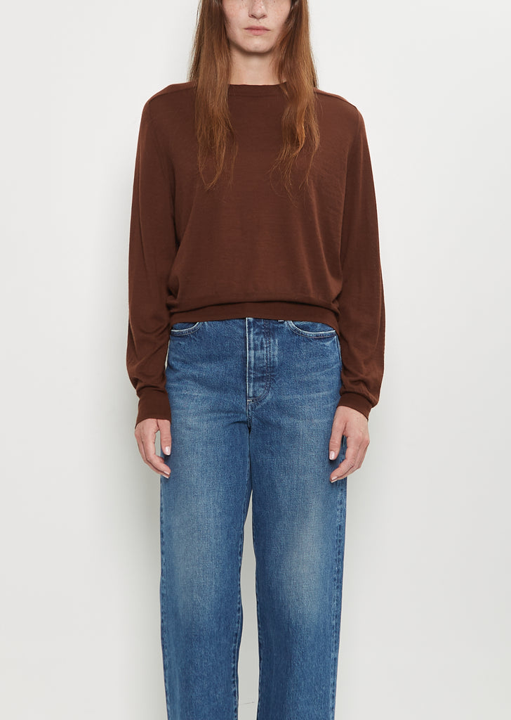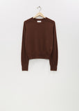 Loulou de Saison brown slightly cropped sweater with a crew neckline in a thin, lightweight cashmere knit. Features saddle shoulders and ribbed trim finish at neckline, cuffs, and hem. Relaxed fit.
