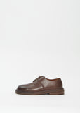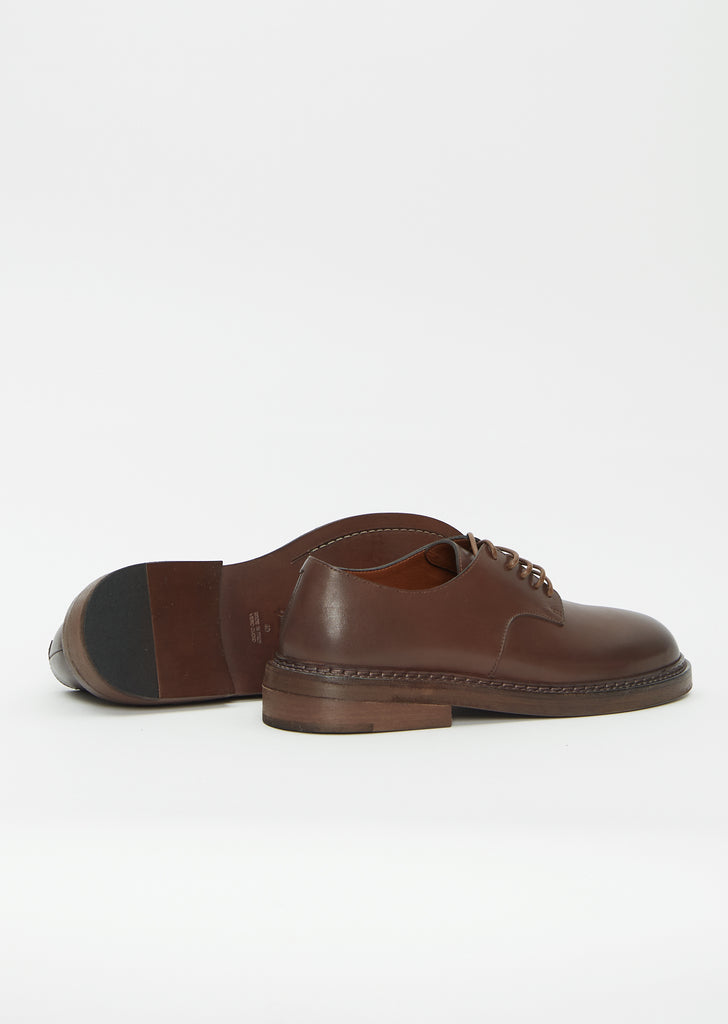 Icons Collection — Marsèll chocolate brown derby oxfords with a rounded toe handcrafted in smooth waxed leather. Fully lined in tonal leather and set on a stacked leather heel. Finished with tonal waxed laces and topstitch detailing at the soles. Heel measures: Approximately 1.5" / 38.1 mm.