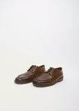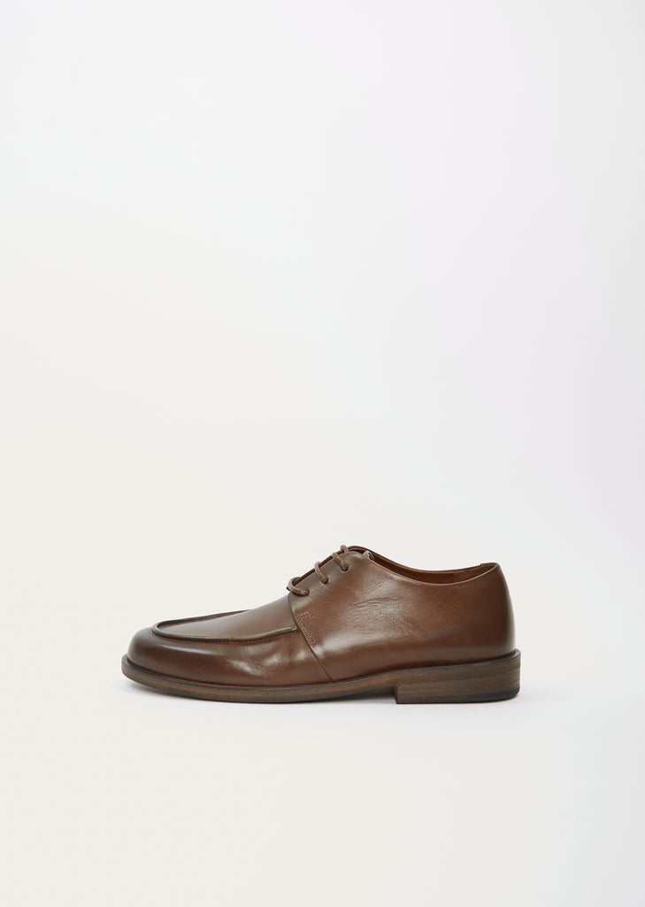 Marsèll brown derby oxfords with a rounded toe and thin piping detailing handcrafted in smooth waxed leather. Fully lined in tonal leather and set on a stacked heel. Finished with tonal waxed laces and topstitch detailing at the soles.