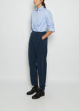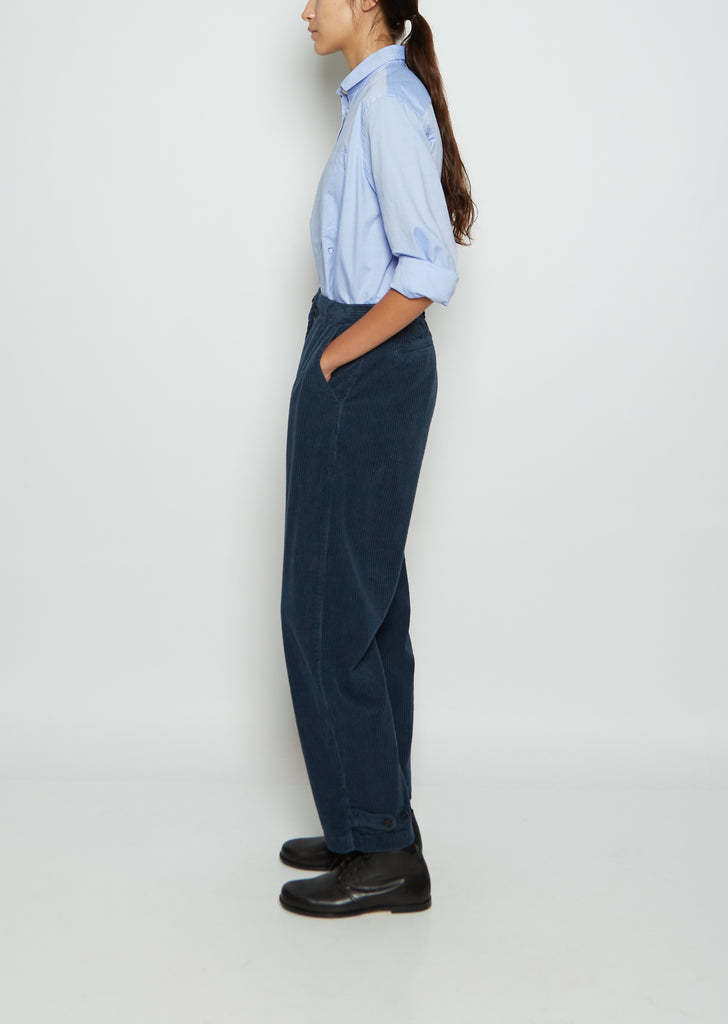 Massimo Alba high-waist tapered leg pant with an adjustable ankle band in blue cotton corduroy. Features a silver-toned zipper fly fastening, single black button closure at the waist and side slit pockets with back welt pockets.