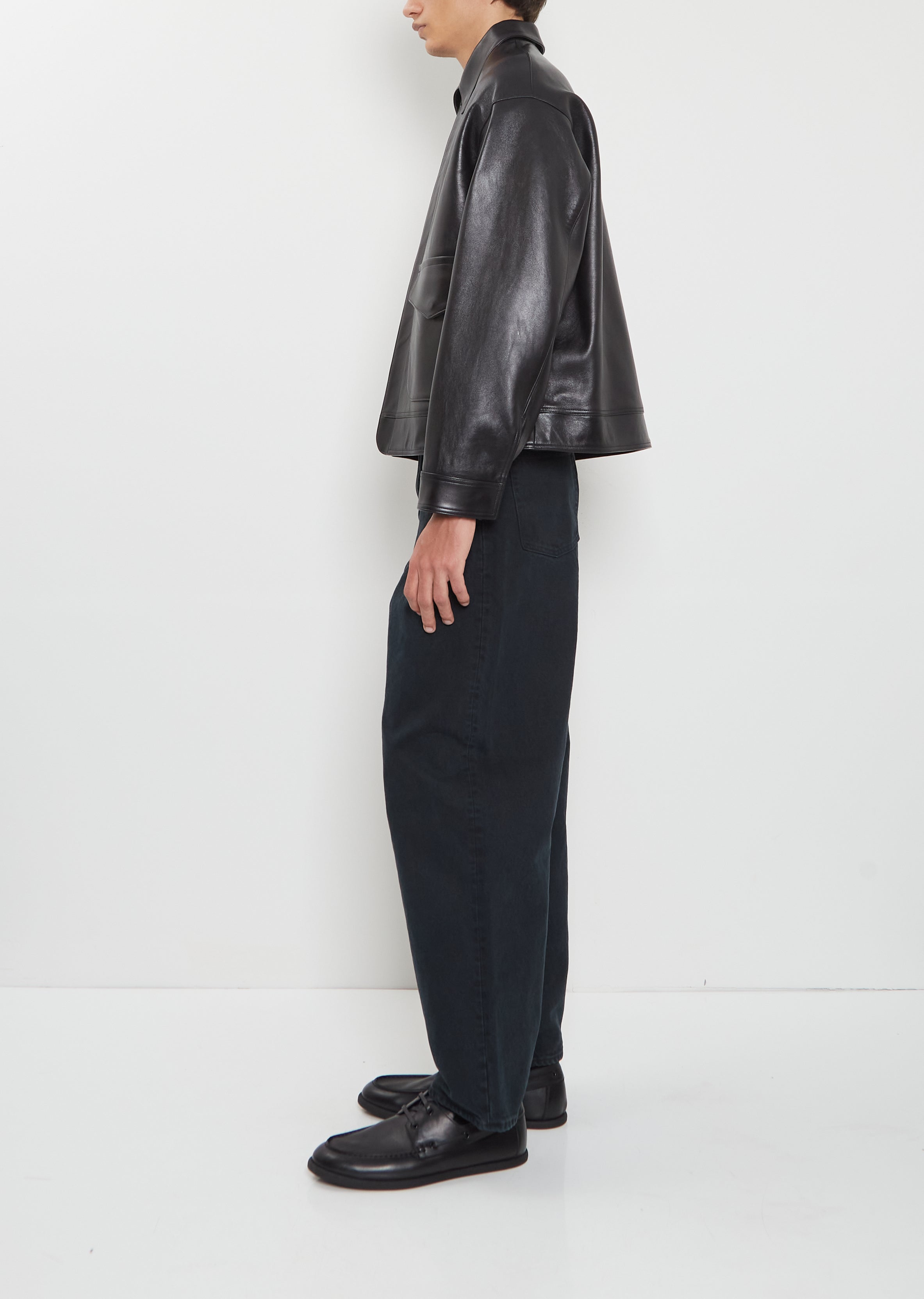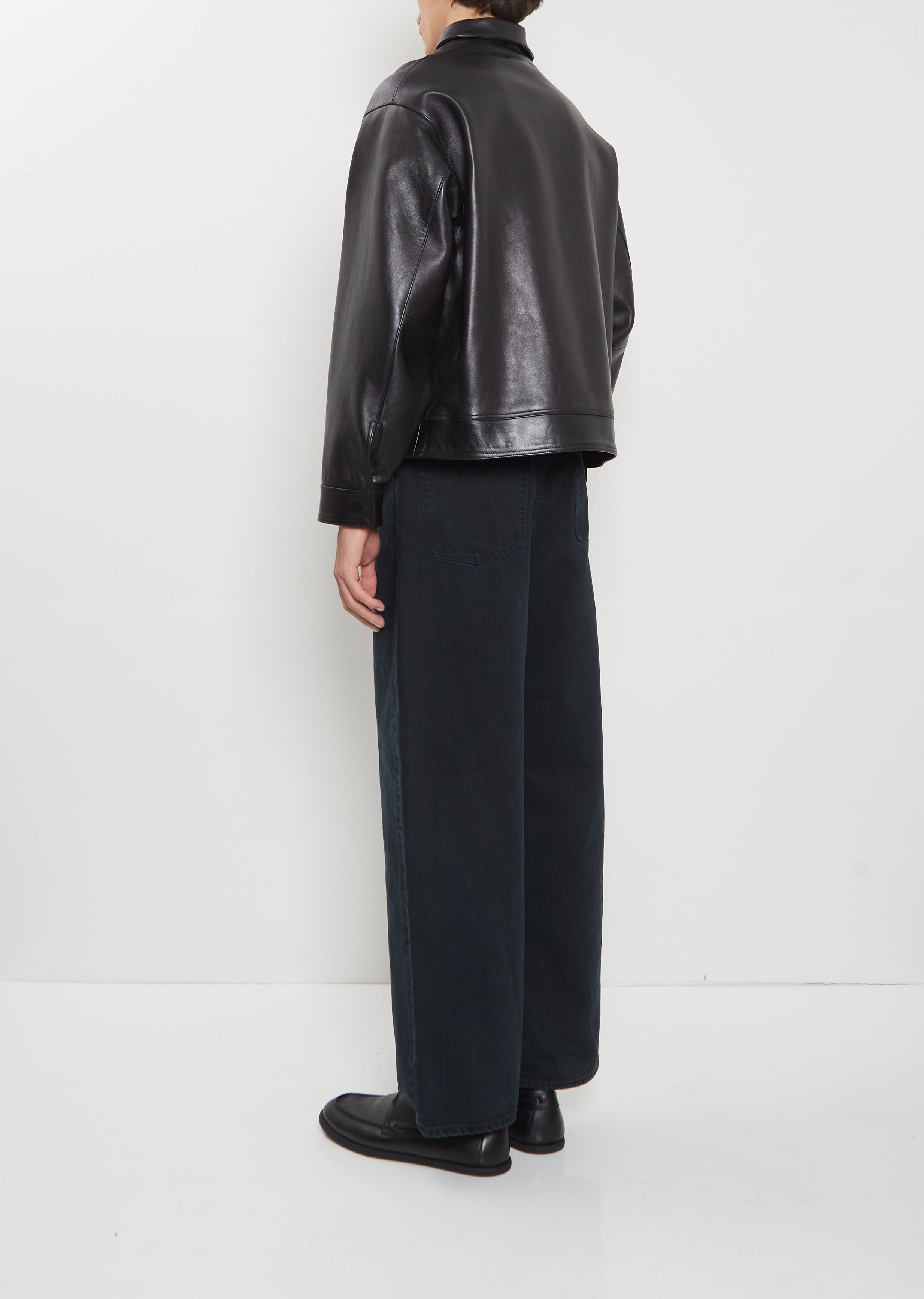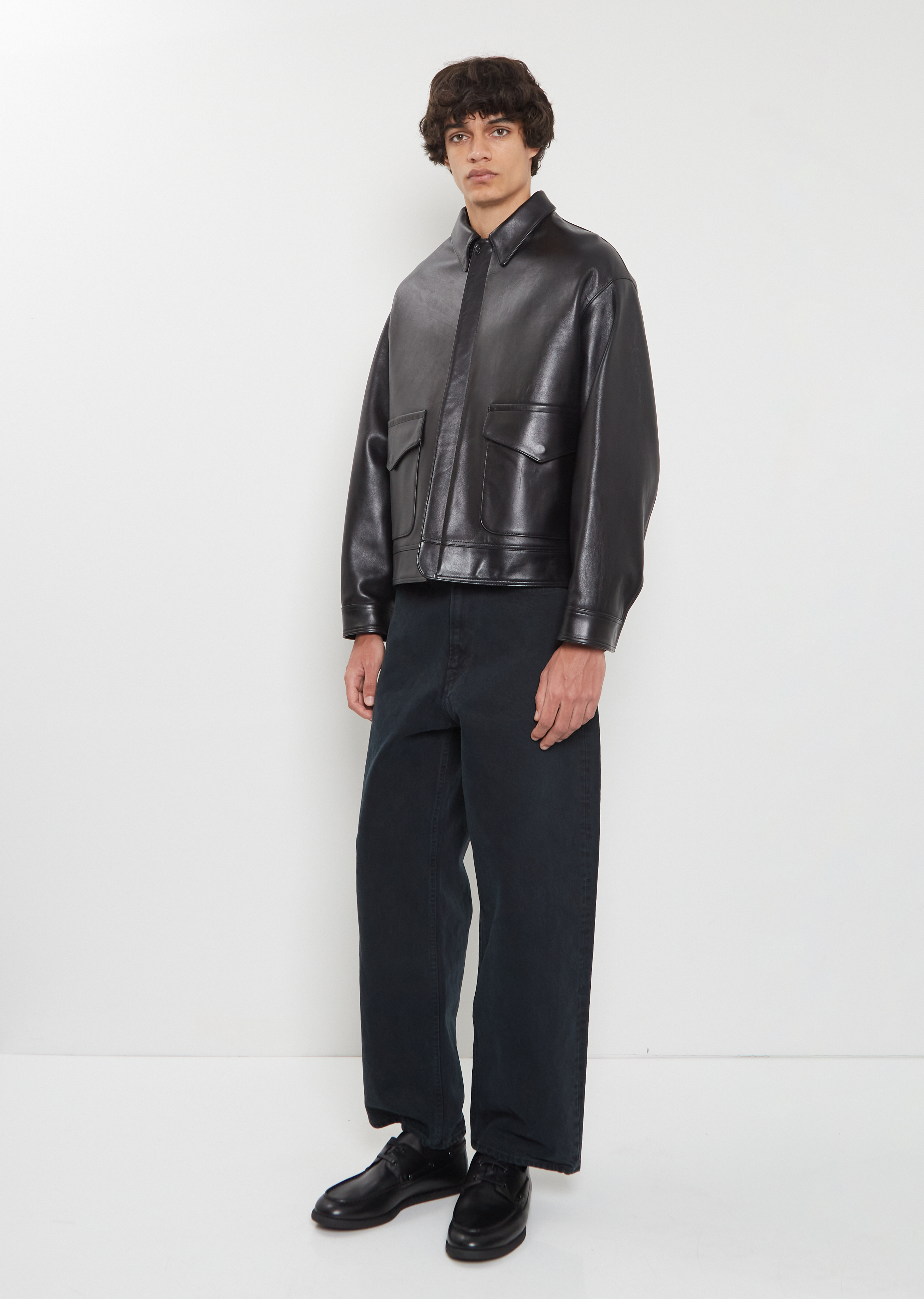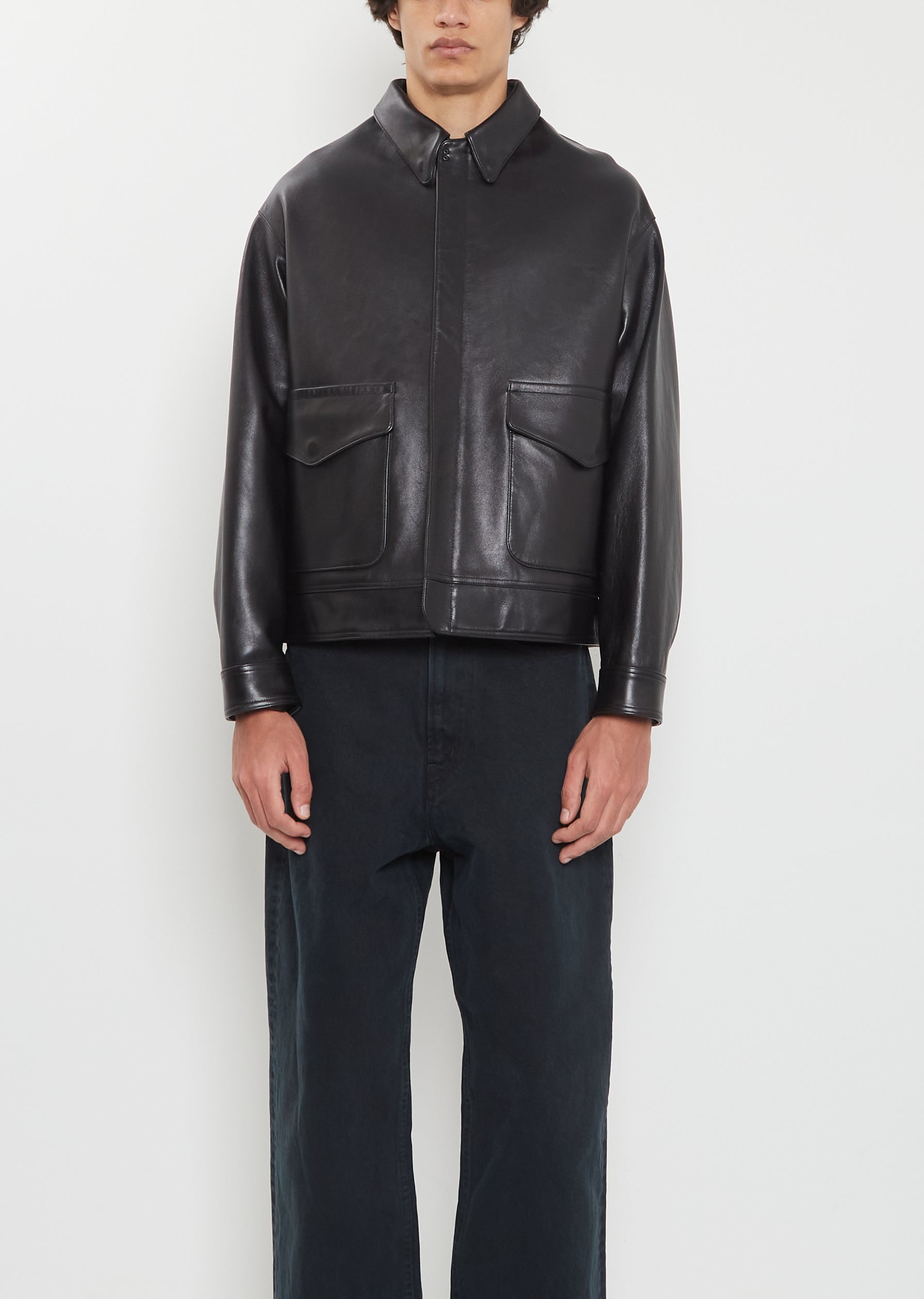 A.PRESSE black jacket with dropped shoulders and classic collar in soft and flexible lambskin leather. Features two deep flap pockets at front, tonal topstitching throughout and a concealed zipper placket.