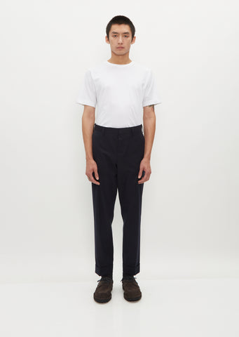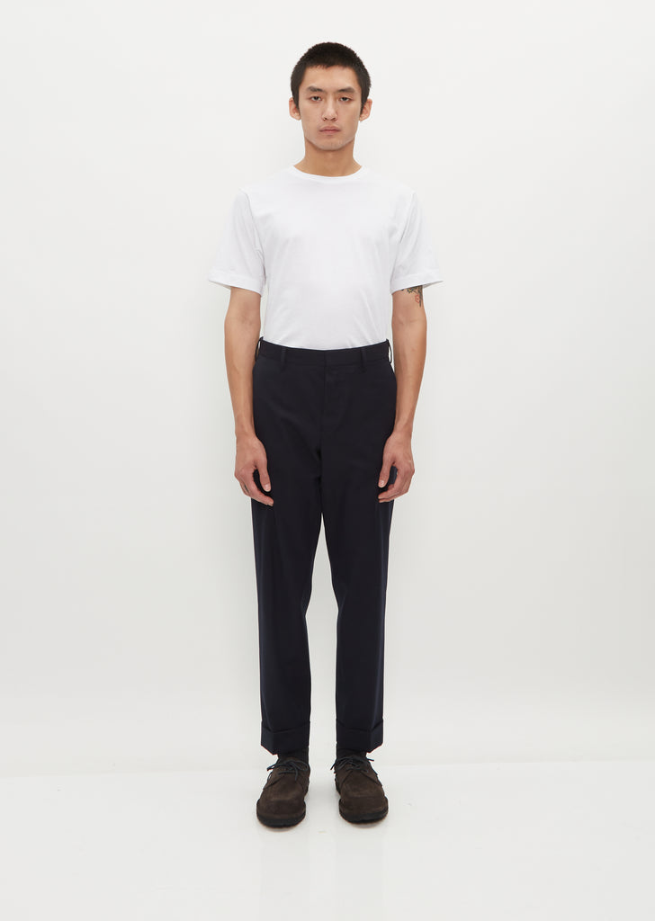 Brand Signature Piece — Dries Van Noten navy regular fit pant with cropped leg and mid-rise fit in cotton wool gabardine. Features a cuffed hem, pressed creased on front and back, side slip pockets, and rear welt flap pockets with single button fastener. Finished with belt loops and a concealed zip fly with hook tab at top.