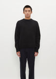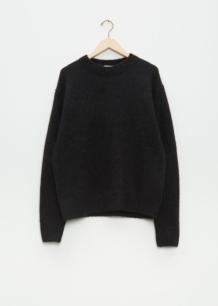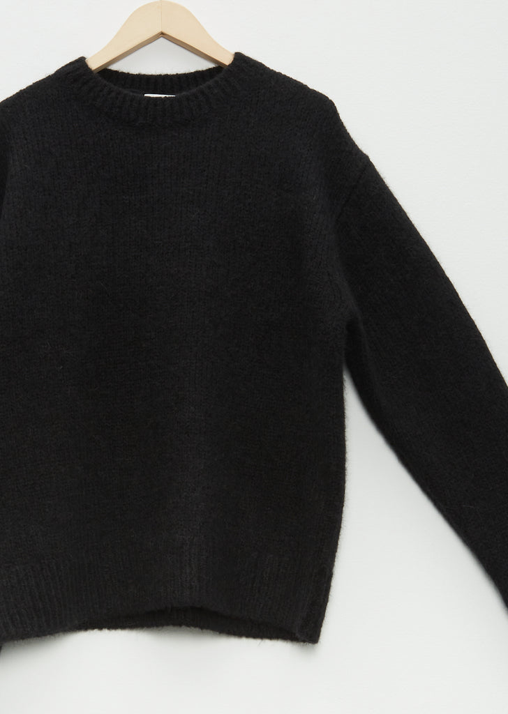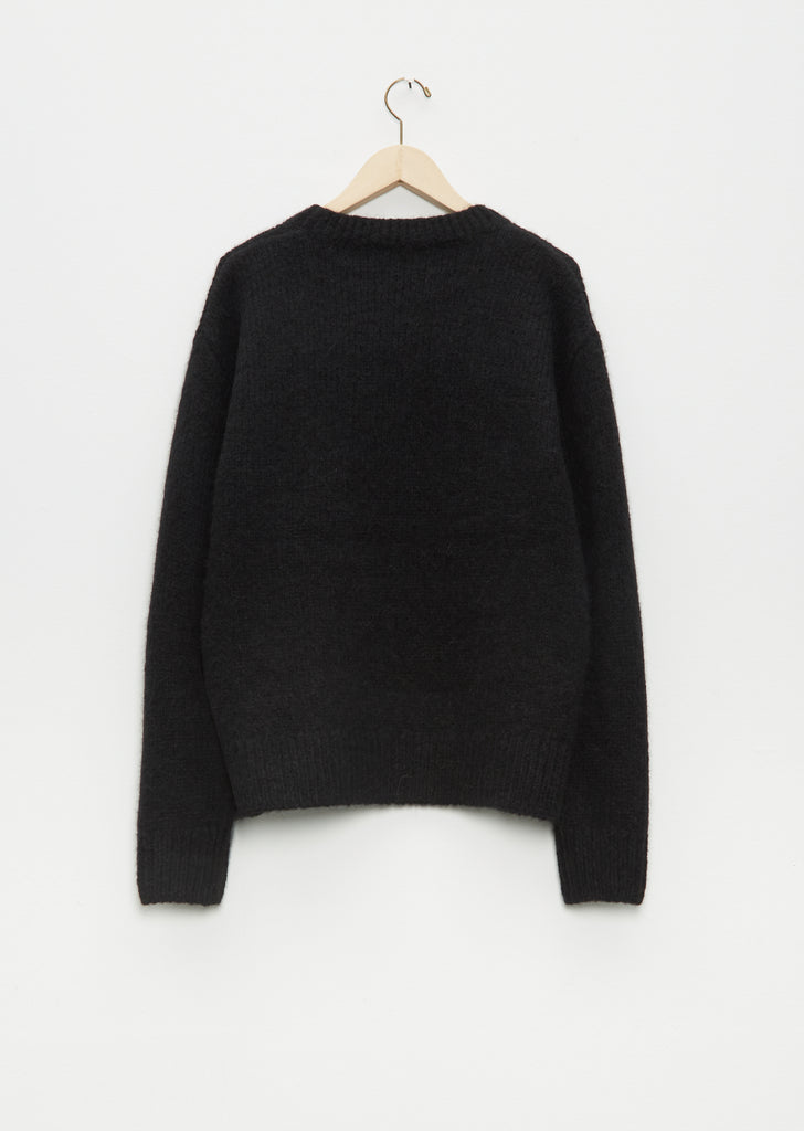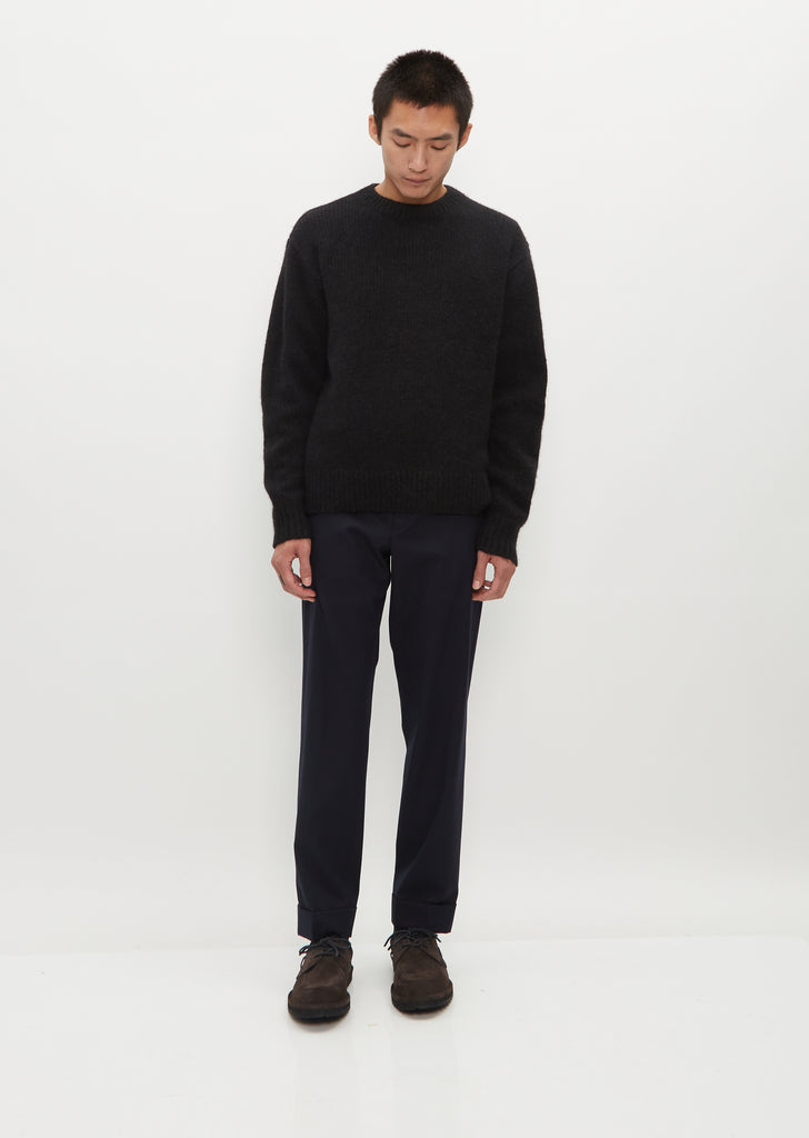 Dries Van Noten black sweater with an oversized silhouette knit in alpaca merino wool blend knit. Features a round neckline, dropped shoulders, and thick ribbed trim borders.