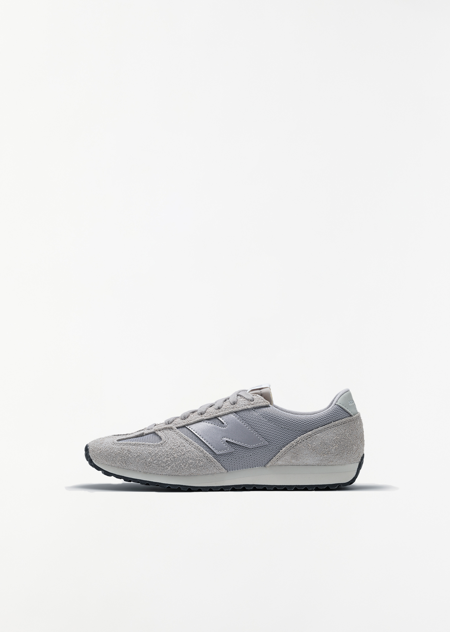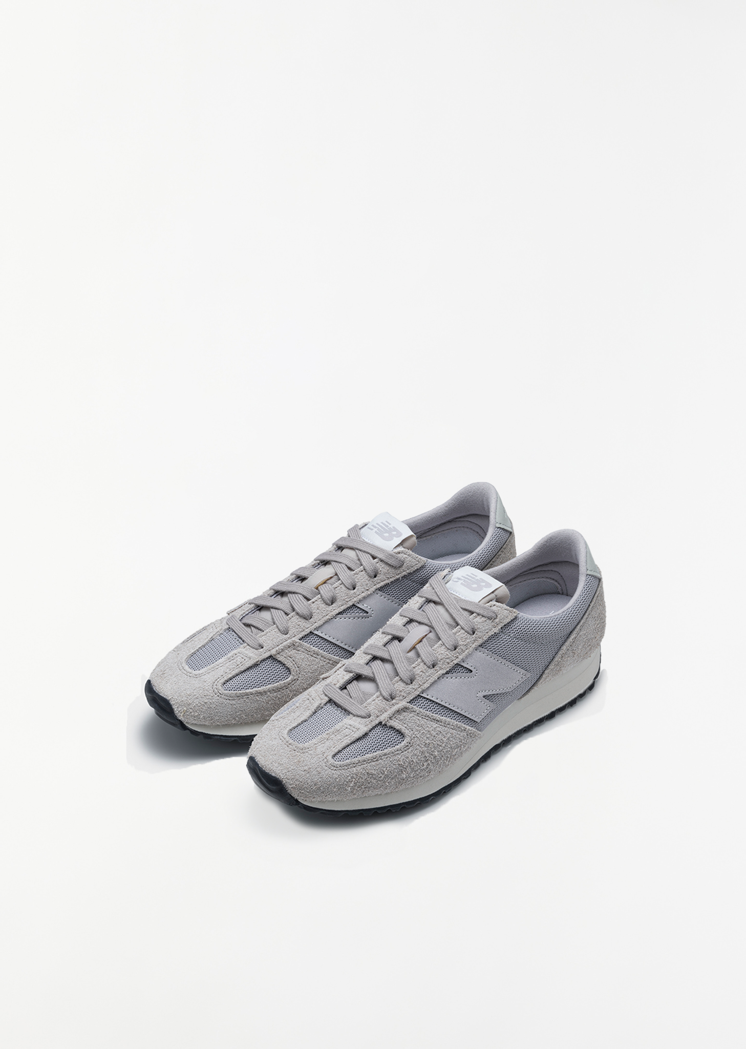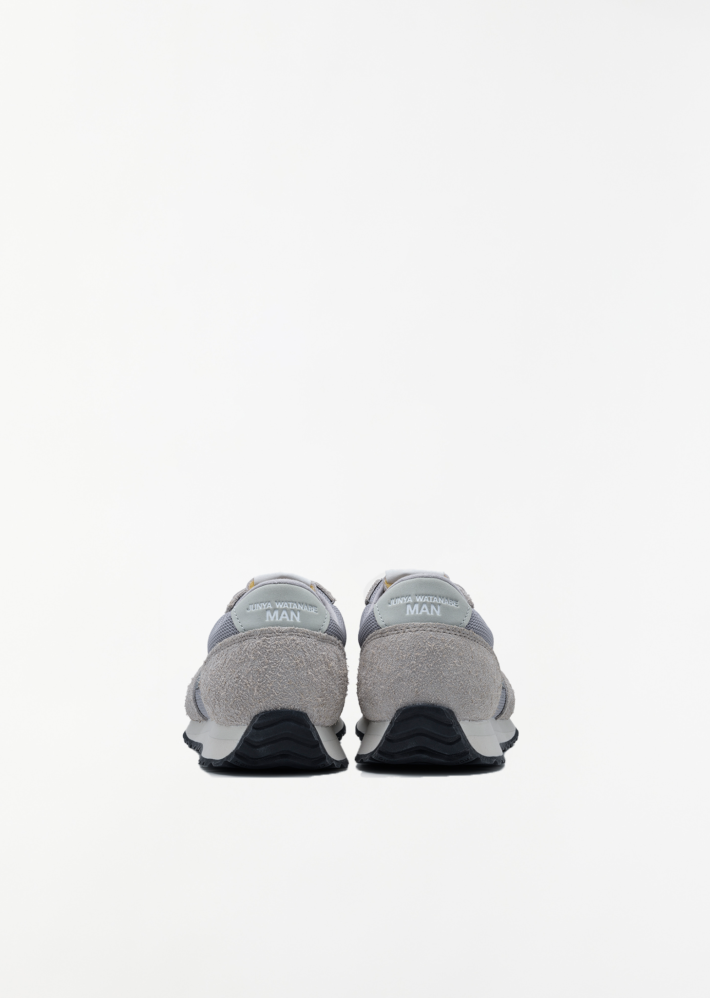 Junya Watanabe MAN in collaboration with New Balance grey signature U471 low top lace-up sneaker with a slim silhouette in breathable mesh underlay and rugged suede overlays. Features tonal laces fastening, exposed-foam tongue, EVA midsole, logo detail at side and back heel, and a rubber outsole with classic herringbone pattern.