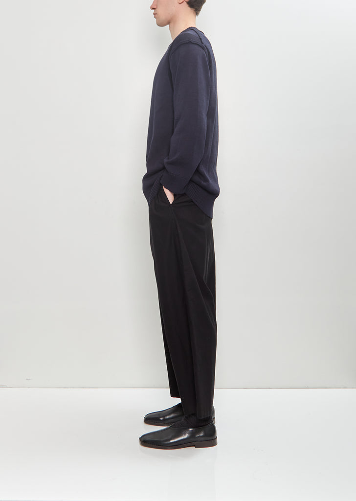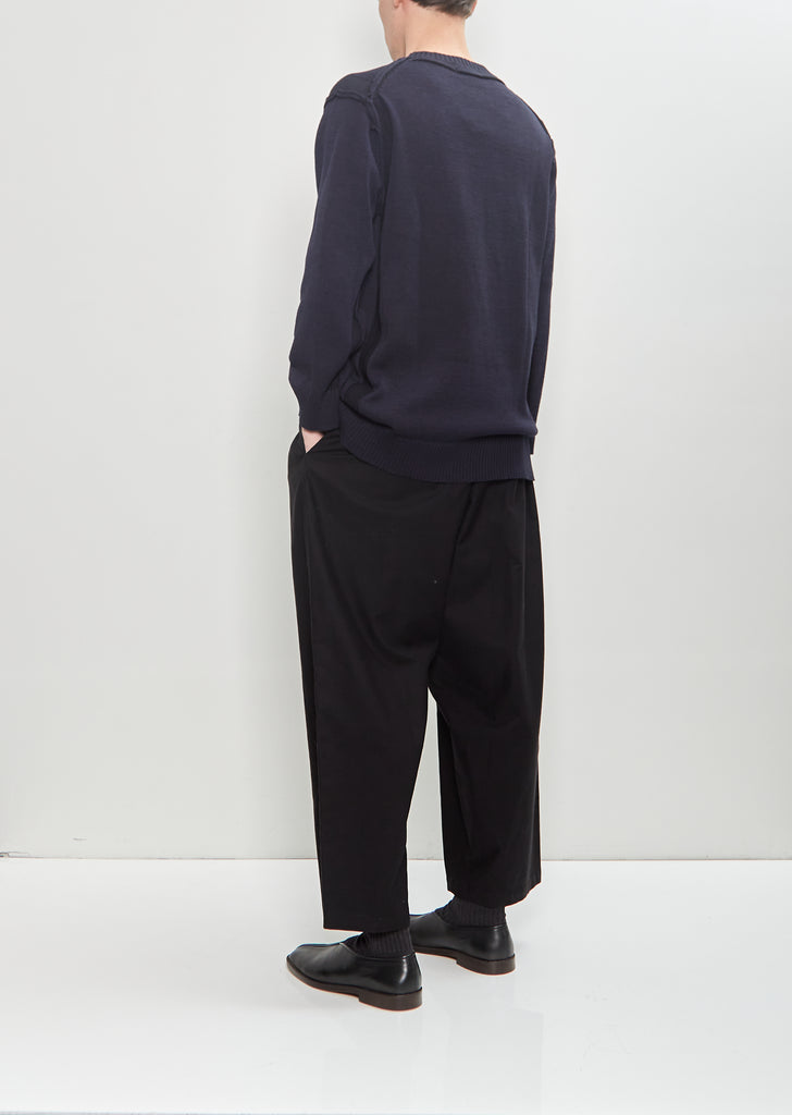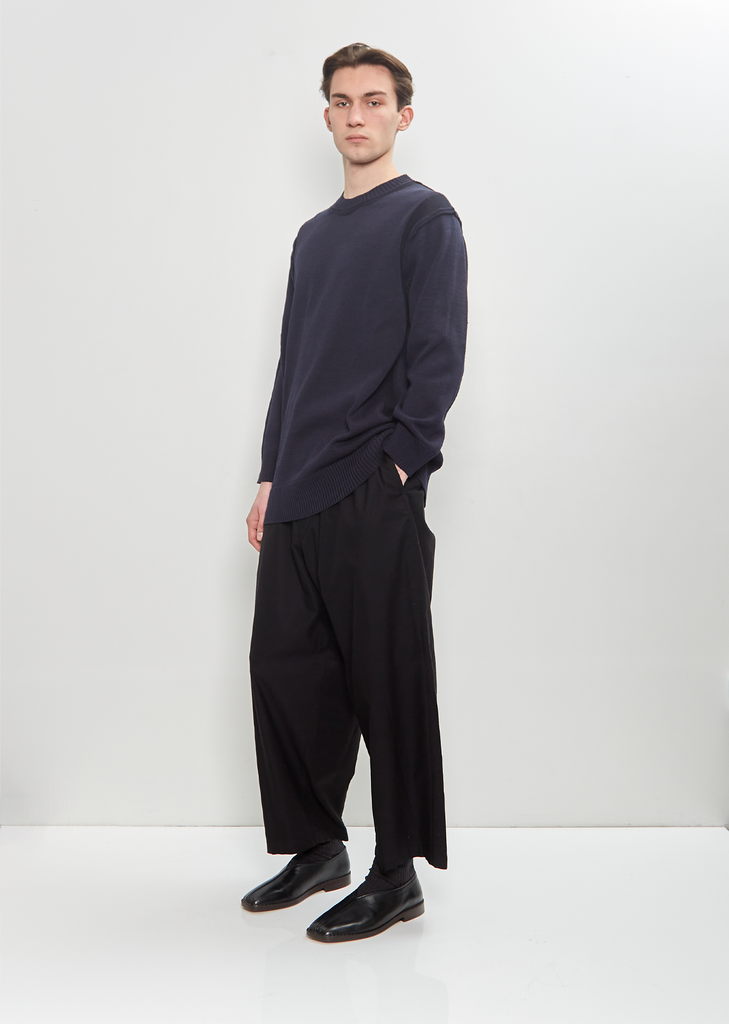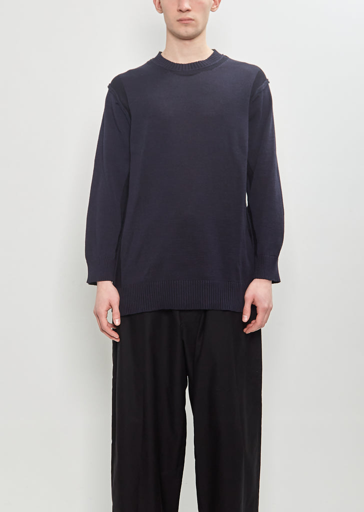 Yohji Yamamoto Pour Homme navy sweater with contrast knit details throughout in cotton flax blend knit. Features inside-out seams at arms and ribbed trim finish at neckline, cuffs, and hem.