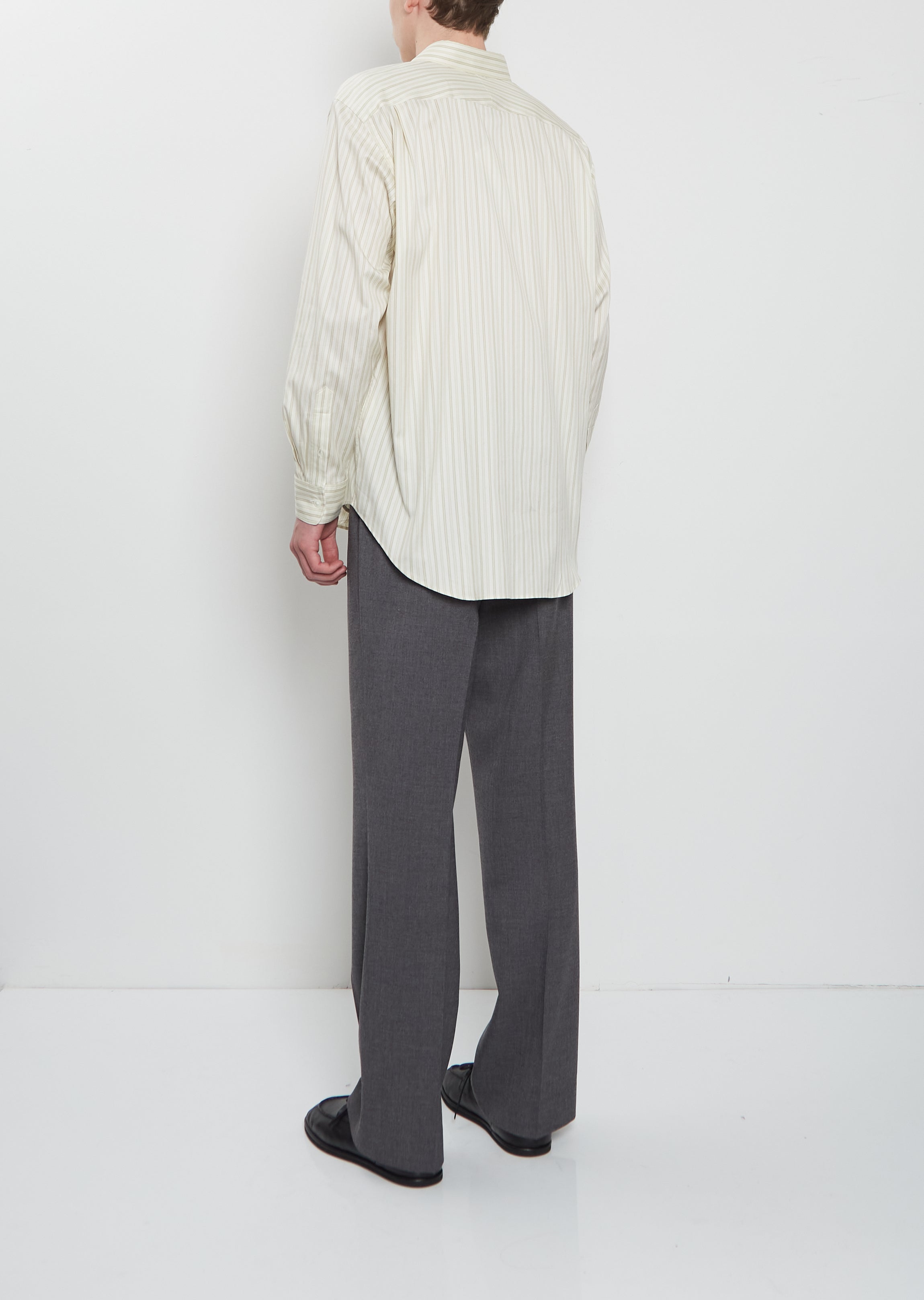 Auralee ivory stripes shirt with a spread collar and slightly dropped shoulders in an airy and soft finely spun premium Egyptian cotton and silk blend. Features buttoned cuffs, pleats at back yoke, curved shirttail and shell-hued buttons placket. Relaxed fit.
