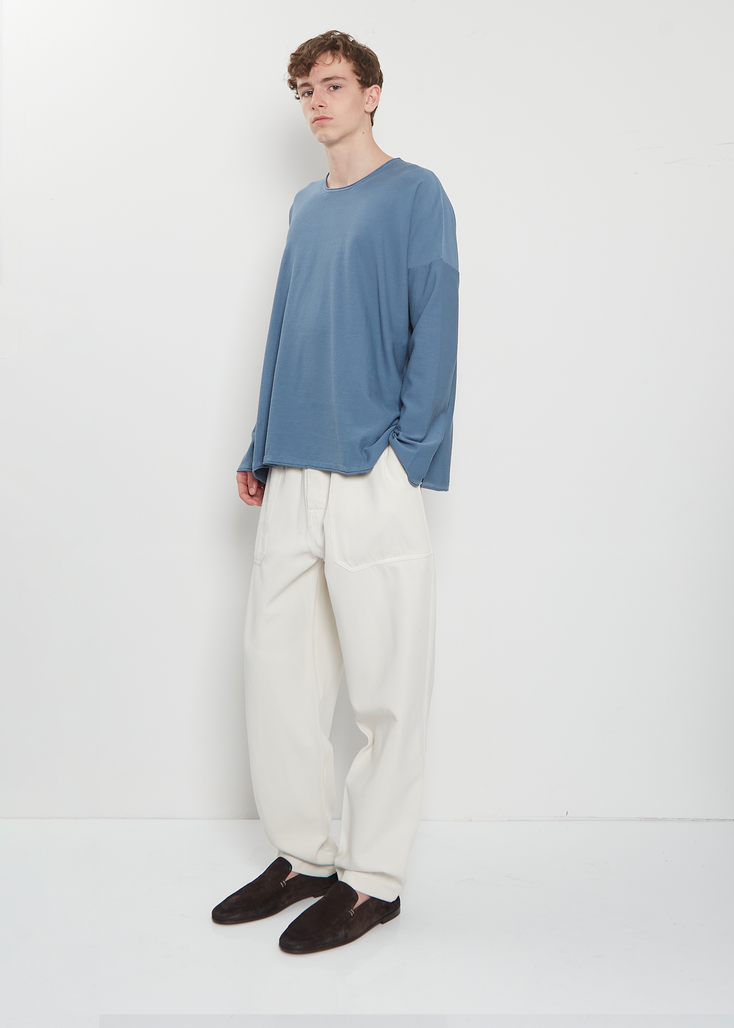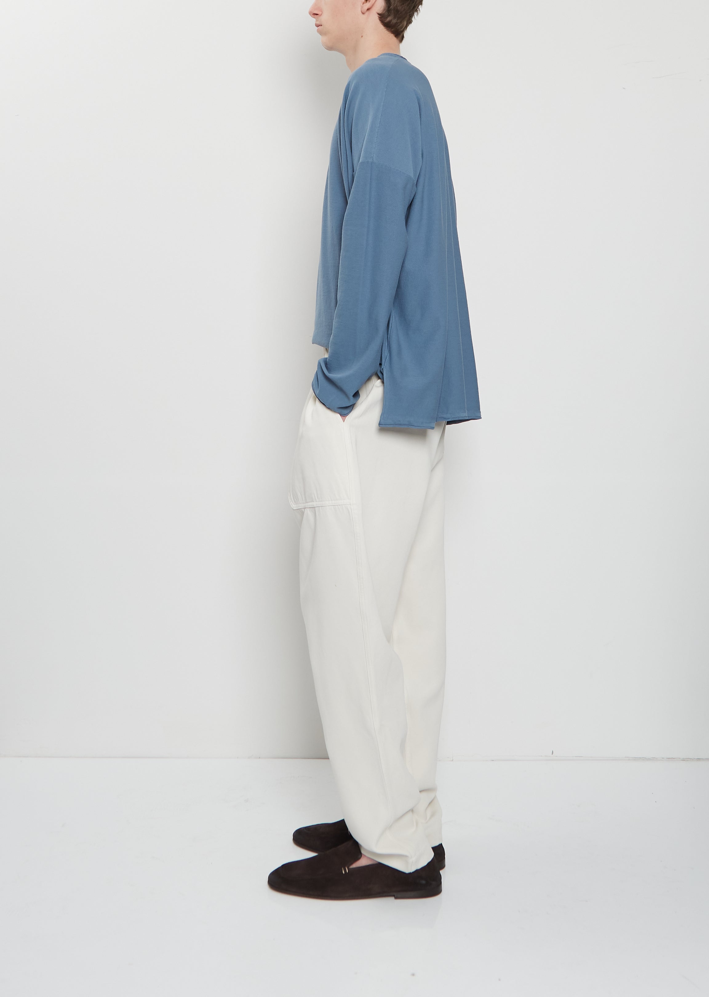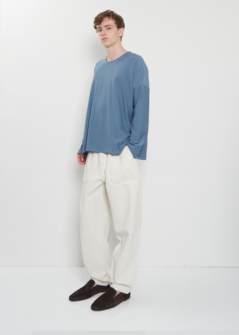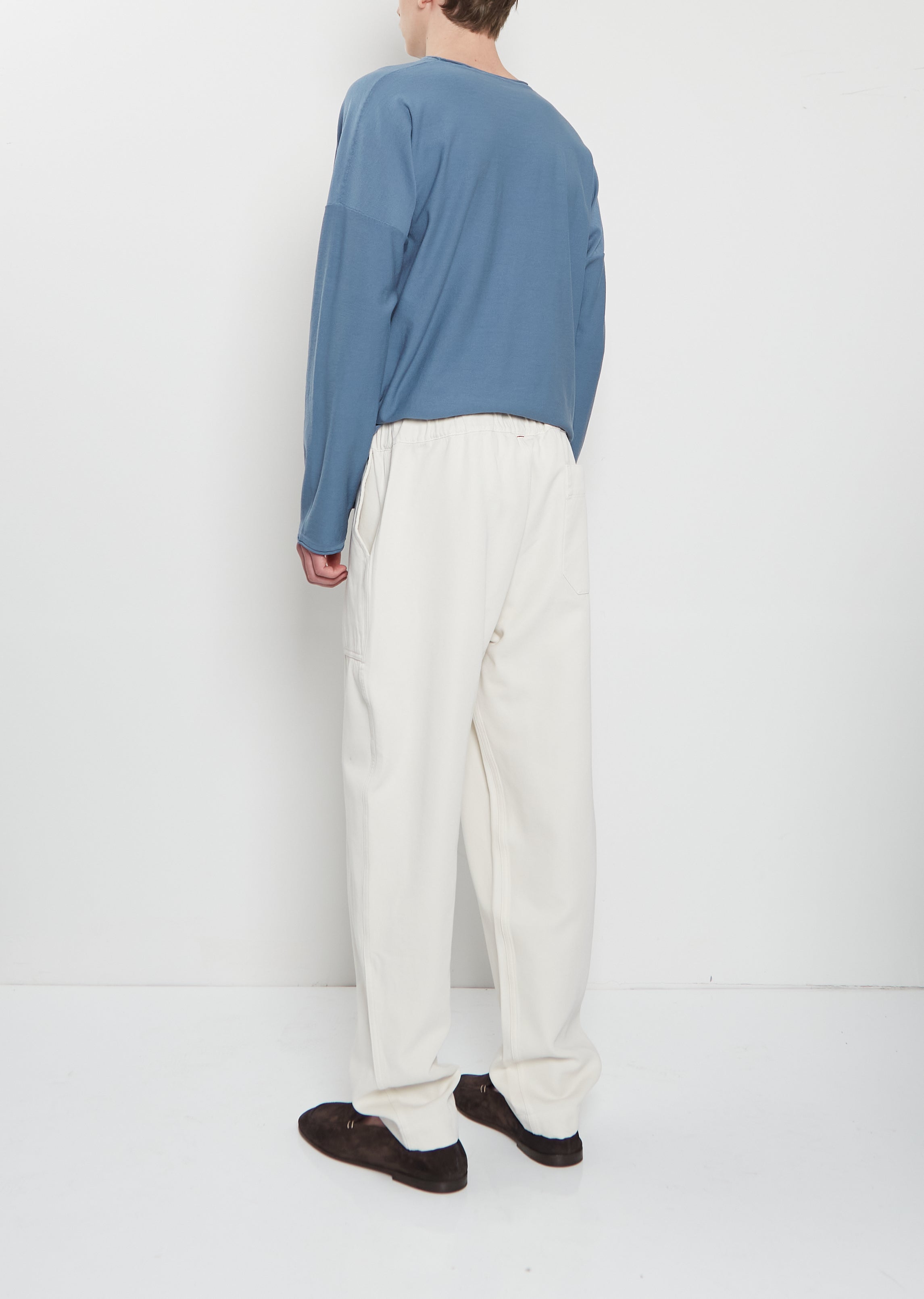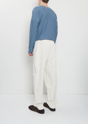 Casey Casey ivory pant crafted in a soft and smooth cotton and viscose blend twill with a slightly shine finish. Features front angled patch pockets, back patch pockets, an elasticated waits with inner drawstring, and button fly. Relaxed fit.