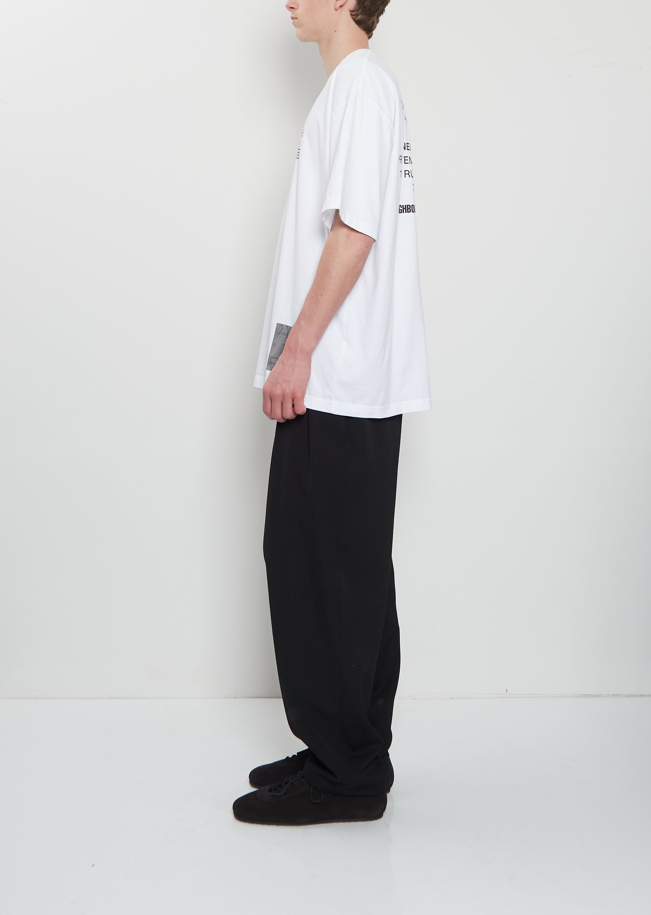 Yohji Yamamoto Pour Homme in collaboration with Neighborhood white and grey short sleeve tee with printed logo and graphic detail crafted in cotton plain stitch fabric with a washed finish. Features a round neckline and straight hem. Relaxed fit.