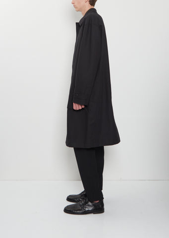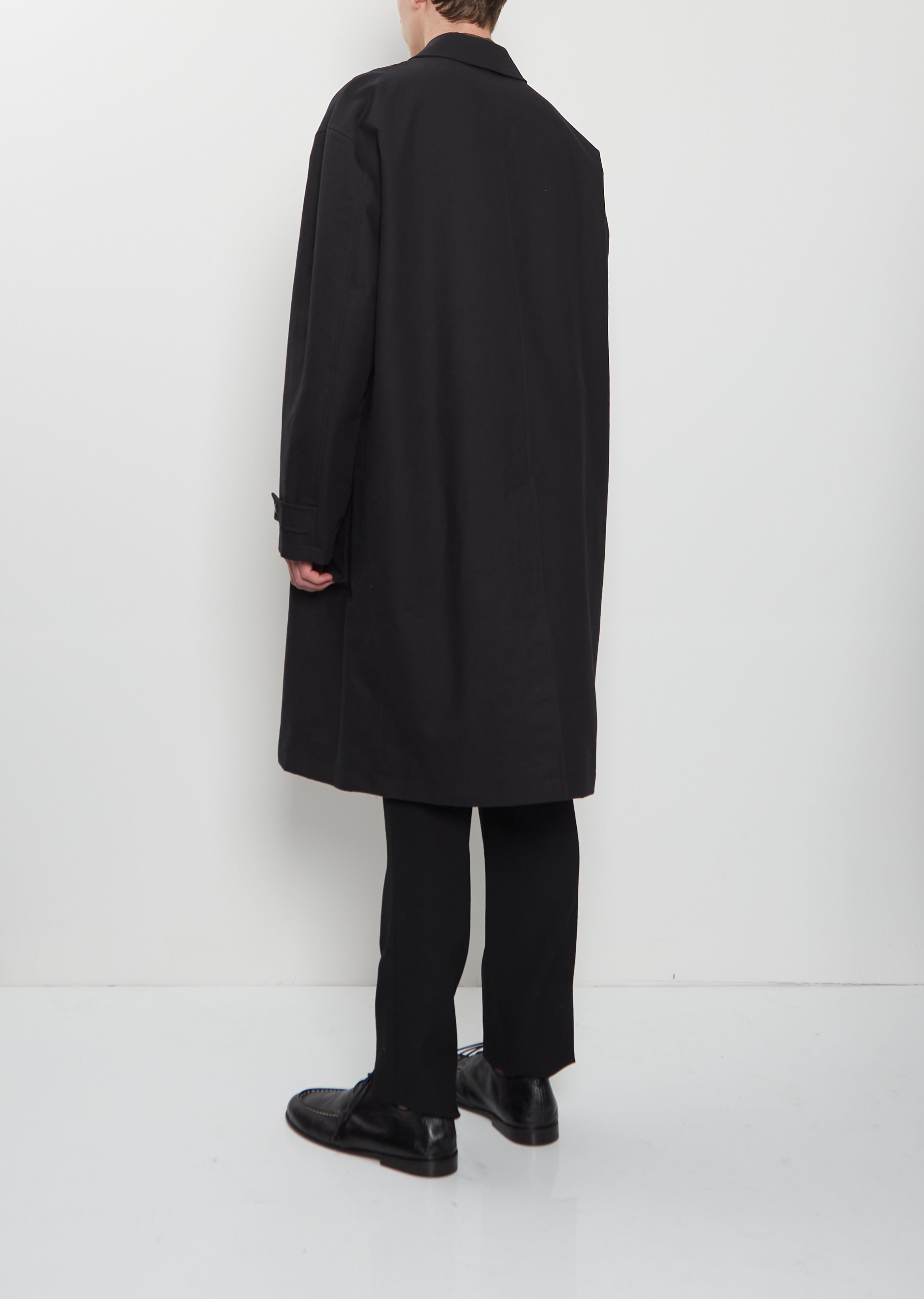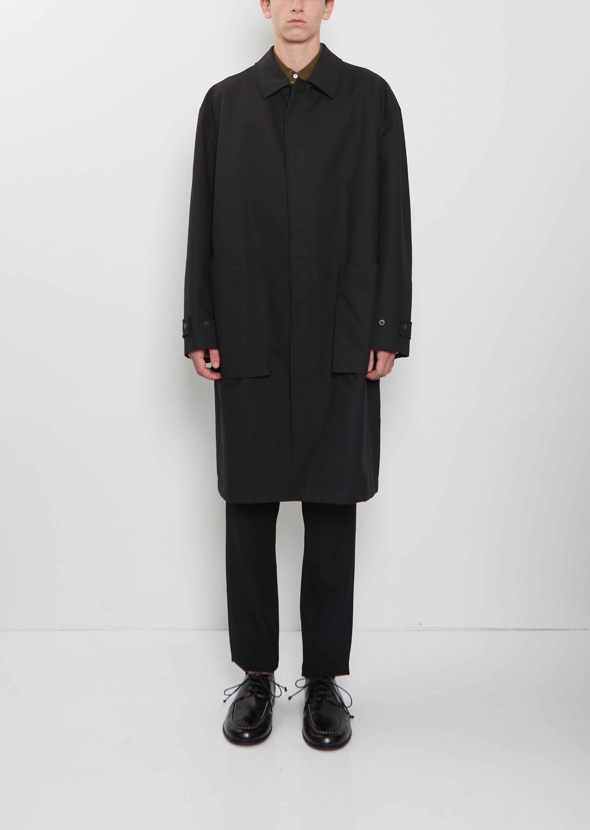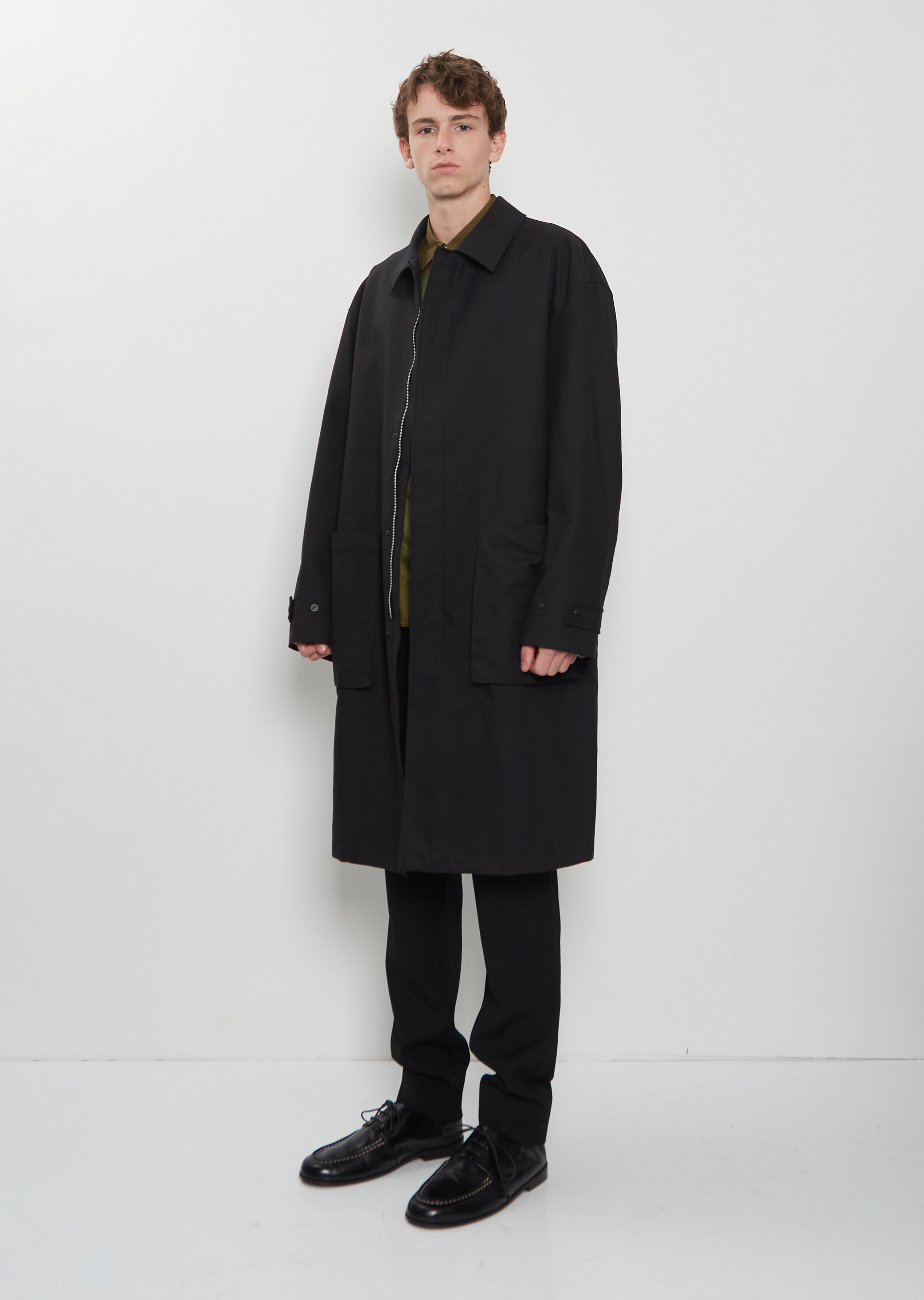Comme des Garçons Homme black coat with a concealed snap buttons and zipper closure in a dense cotton twill. Features a spread collar, deep side patch pockets, tabs at cuffs and vent at back. Lined in tonal cupro.
