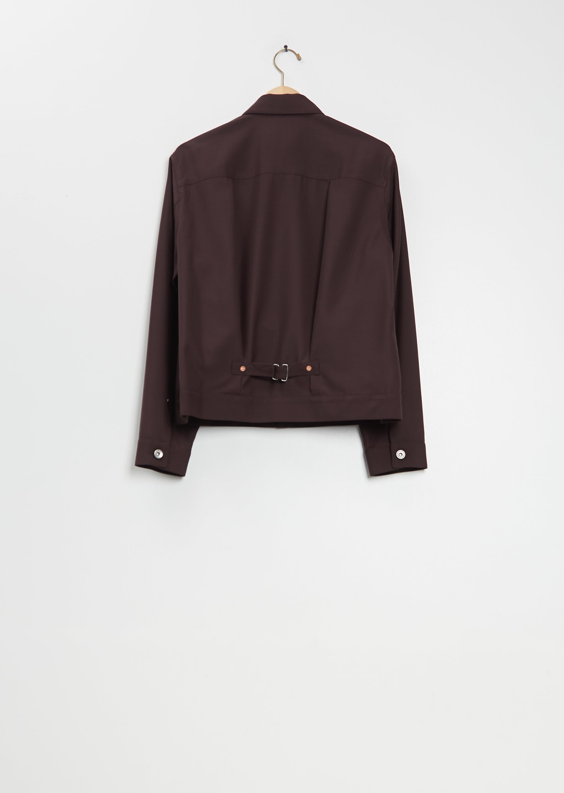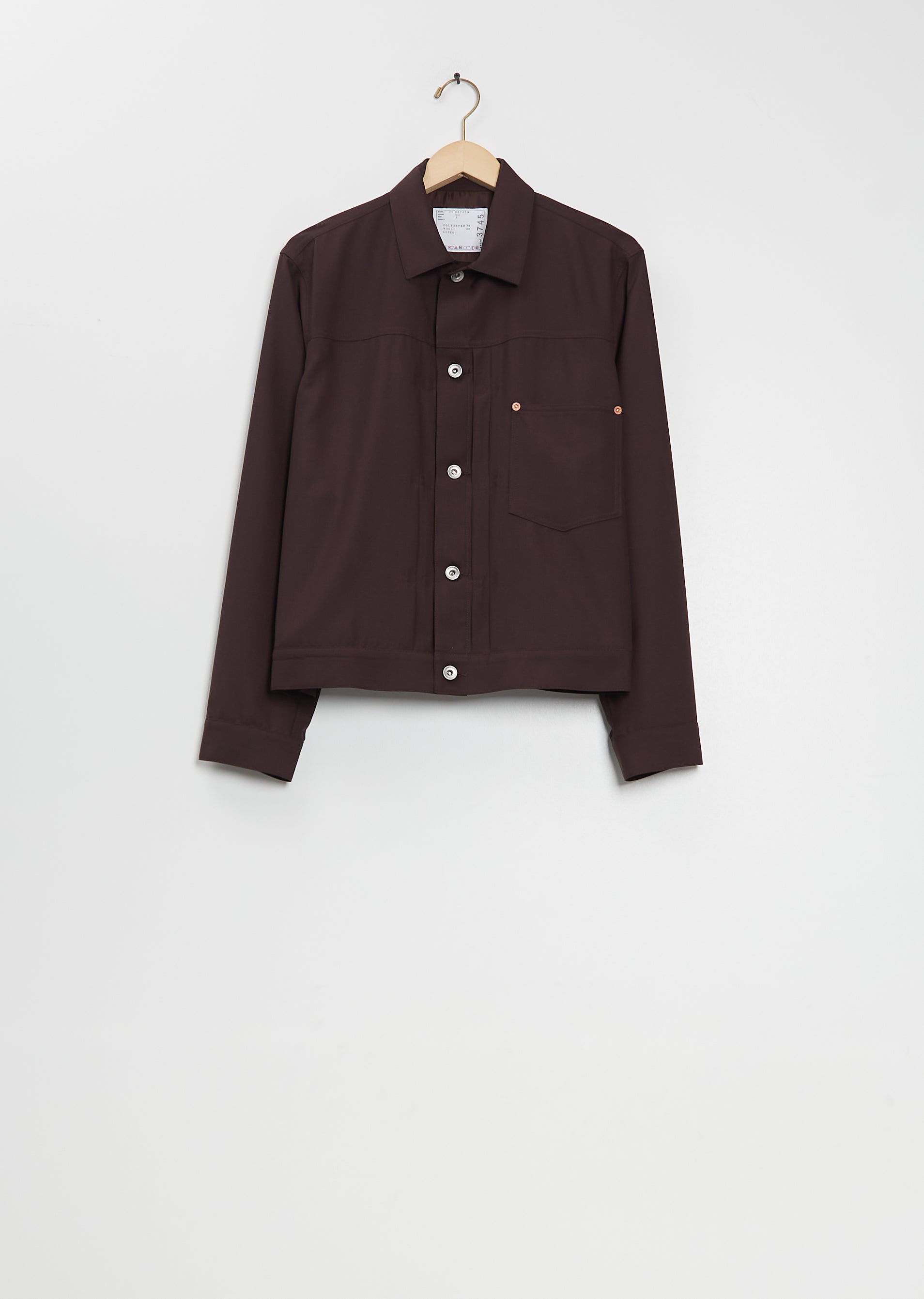 Sacai brown jacket with action pleats at placket and silver-toned button front in a lightweight poly wool blend. Features a chest patch pocket, buttoned cuffs, side seam pockets, and waist adjuster detail at back. Comes unlined.