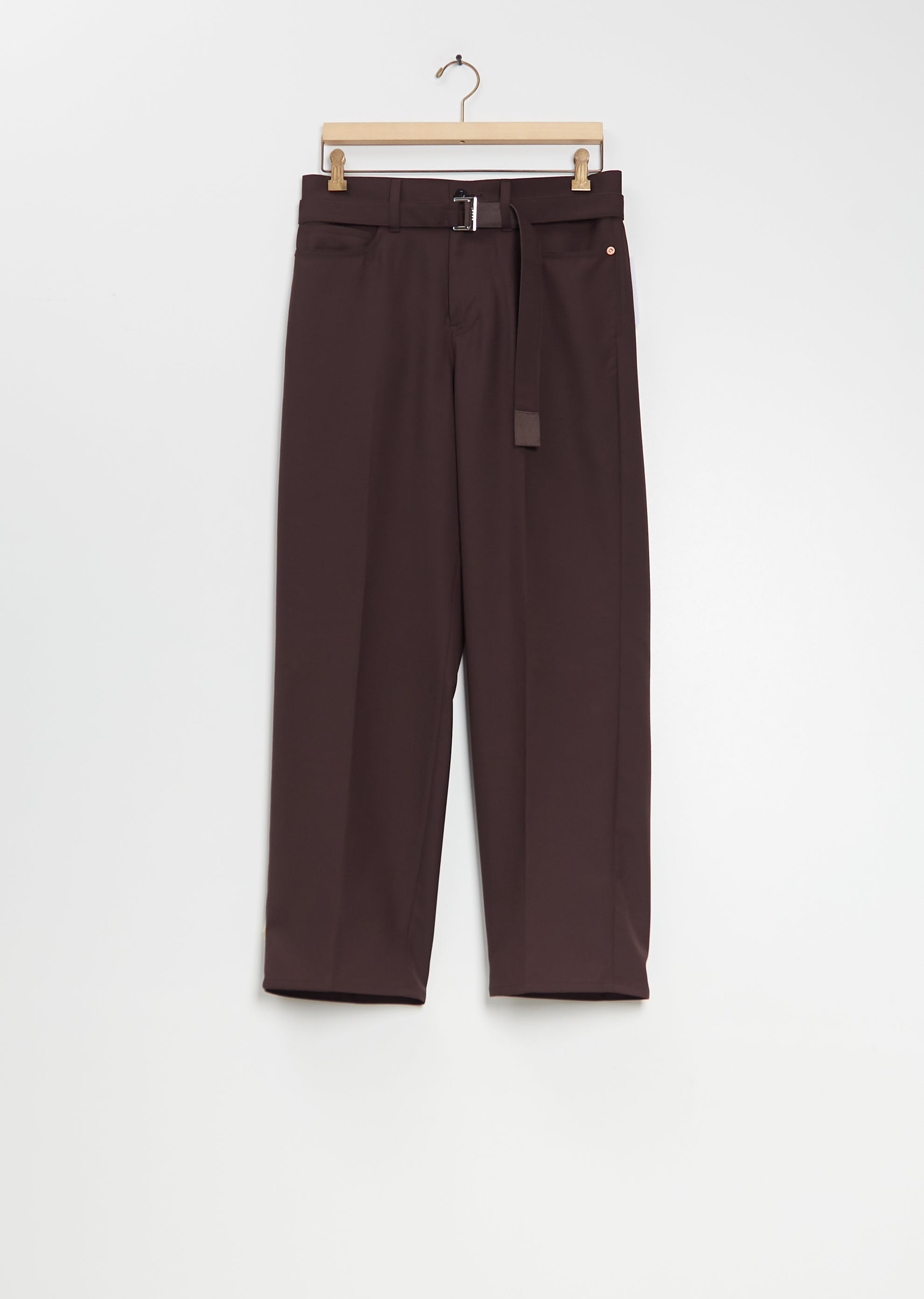 Sacai brown suiting pants with wide, straight legs and adjustable self belt in a lightweight poly wool blend. Features belt loops, herringbone tape backing at belt, a coin pocket, front pockets, pin-tucks at front and back legs, buttoned welt pockets at back, and a button and zip-fly fastening.