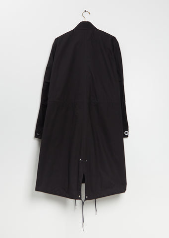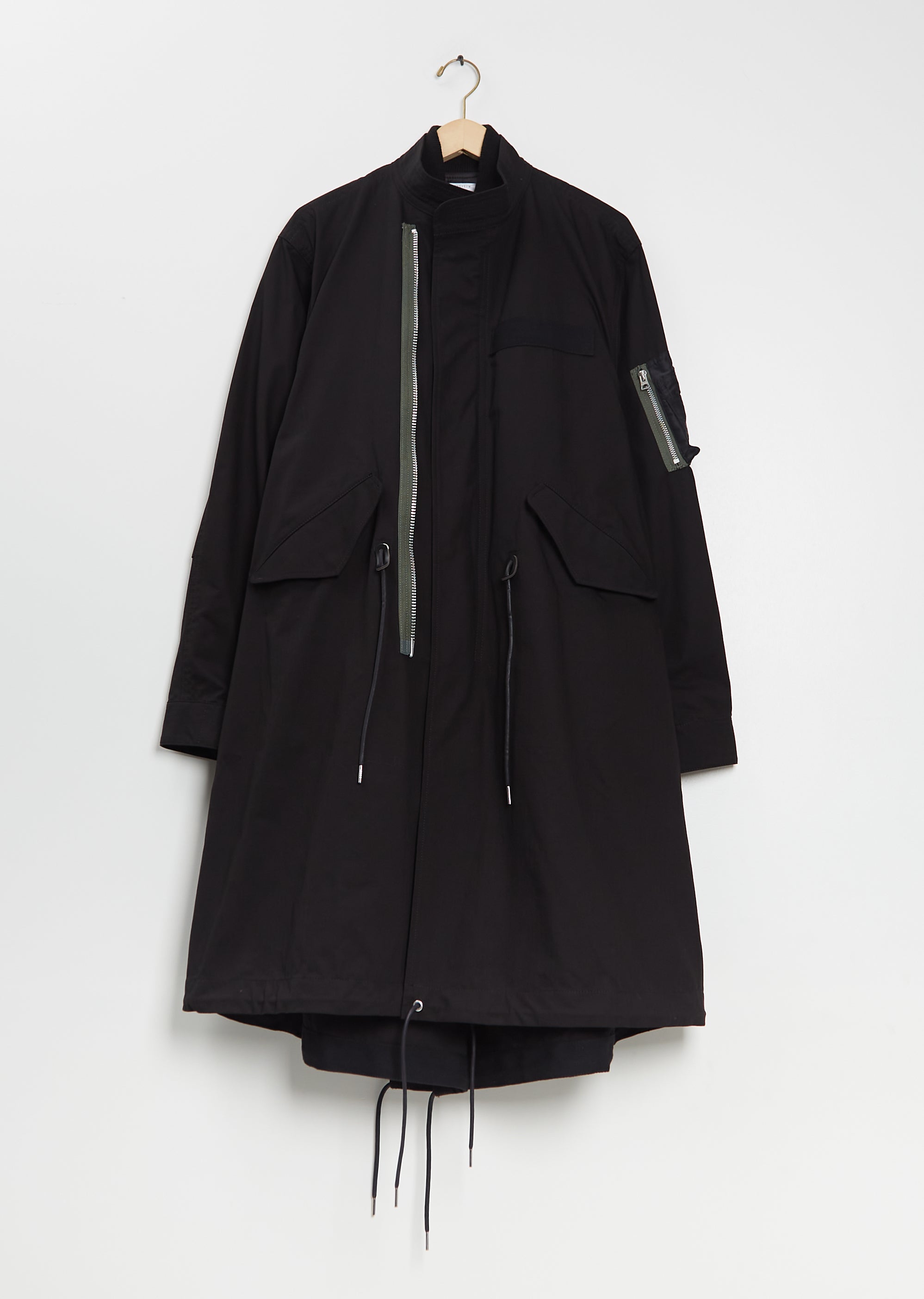 Sacai black coat with an attached interior bomber detail and double zip press button front in cotton nylon ripstop. Features an outer stand collar, an interior bomber collar, double zip closure at bomber, additional zip stringer, angled press button flap welt pockets, adjustable drawstring waist and hem, signature zippered pocket at sleeve, adjustable button cuffs, and slit at back. Front can be zipped in various ways for desired style.
