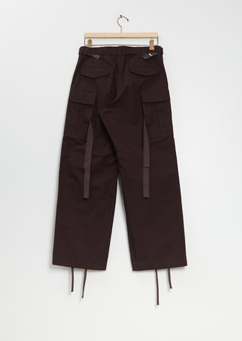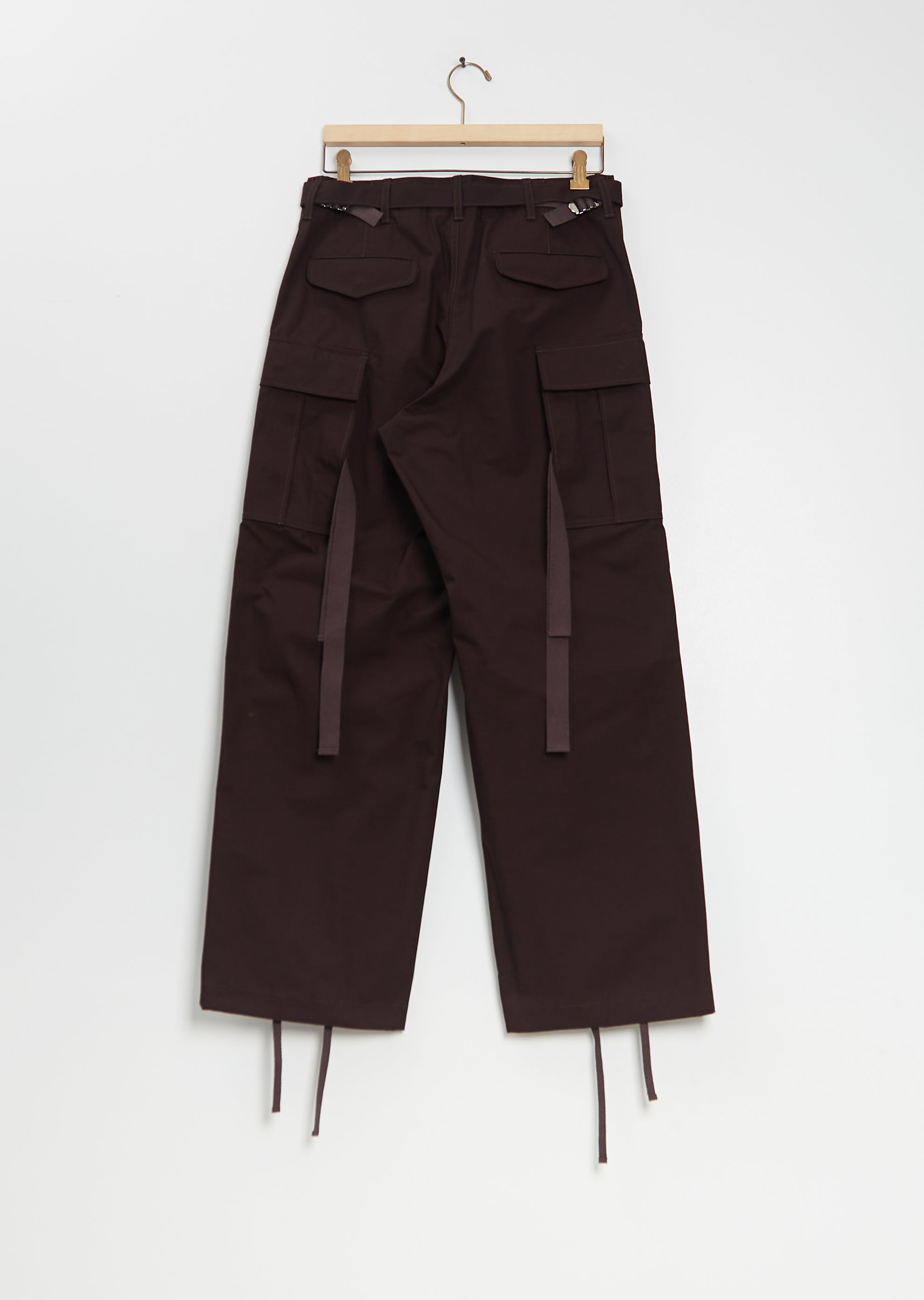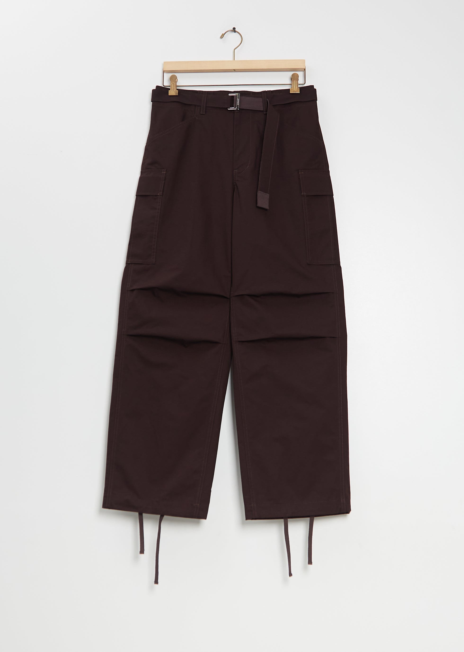 Sacai brown pants with wide, straight legs and adjustable self belt in a cotton nylon ripstop. Features belt loops, herringbone tape backing at belt, angled front pockets, press button flap pockets at legs, pleating details at knees, adjustable drawstring cuffs, waist adjusters at back, press button flap pockets at back, attached herringbone tape details at back, and a button and zip-fly fastening.