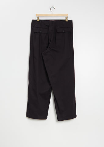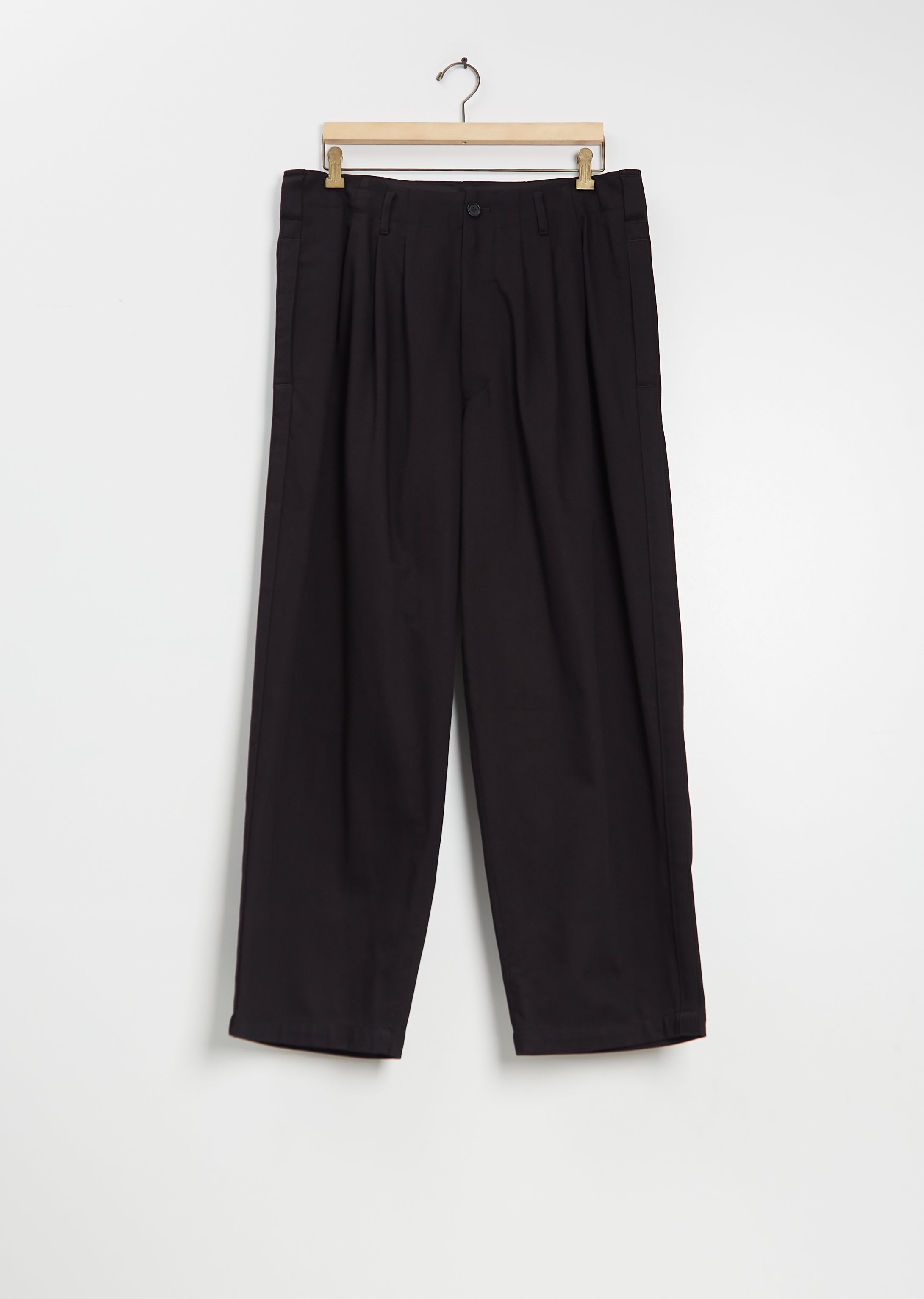 Y's black pants with wide, straight legs and two front pleats in cotton twill. Features belt loops, side seam pockets, taped side seam detailing, buttoned flap welt pockets at back, and a button and zip-fly fastening.