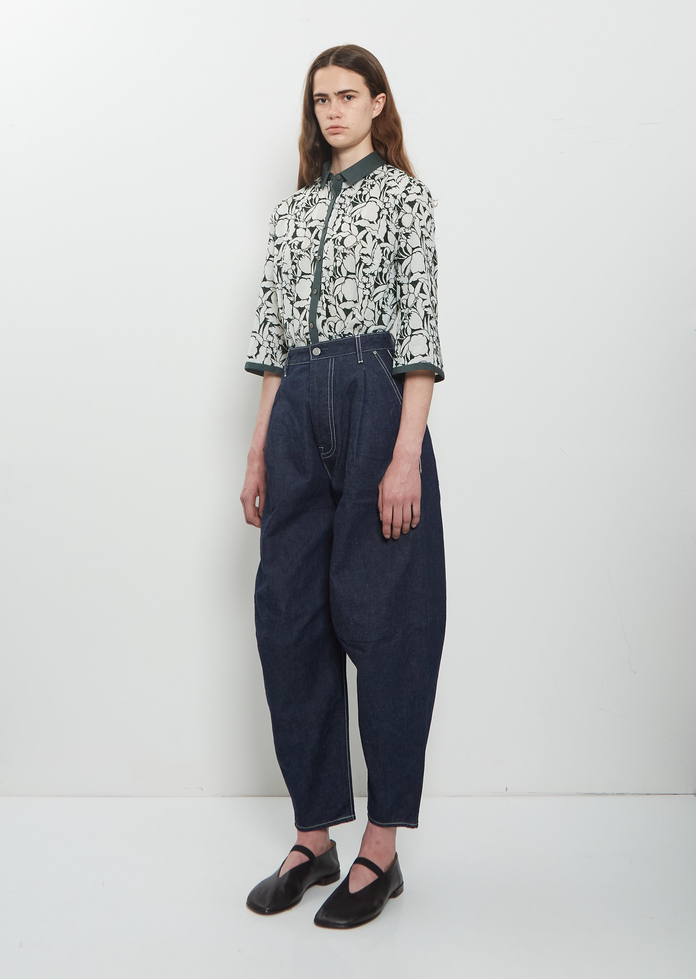Minä Perhonen indigo high-waisted tapered jeans with a pleated waist in mid-weight cotton and linen denim. Features belt loops, angled side pockets, back yoke, patch pockets at back, and buttons zip-fly fastening. Finished with branded buttons and contrasting white stitching throughout.