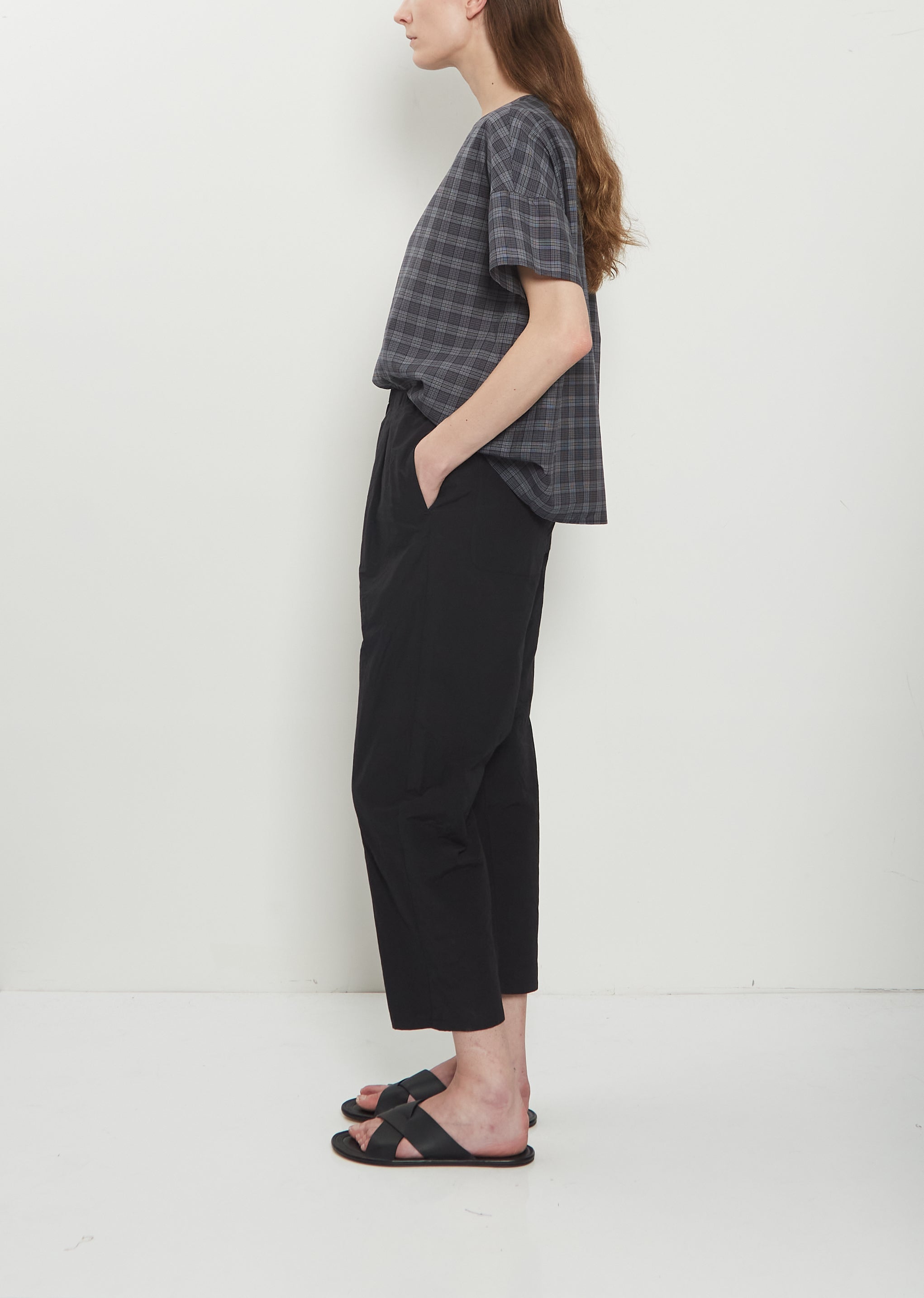 Apuntob black cropped pull-on pants with tapered legs in a crisp and soft technical cotton poplin. Features an elasticated waistline, side seam pockets and two patch pockets at back. Relaxed fit.