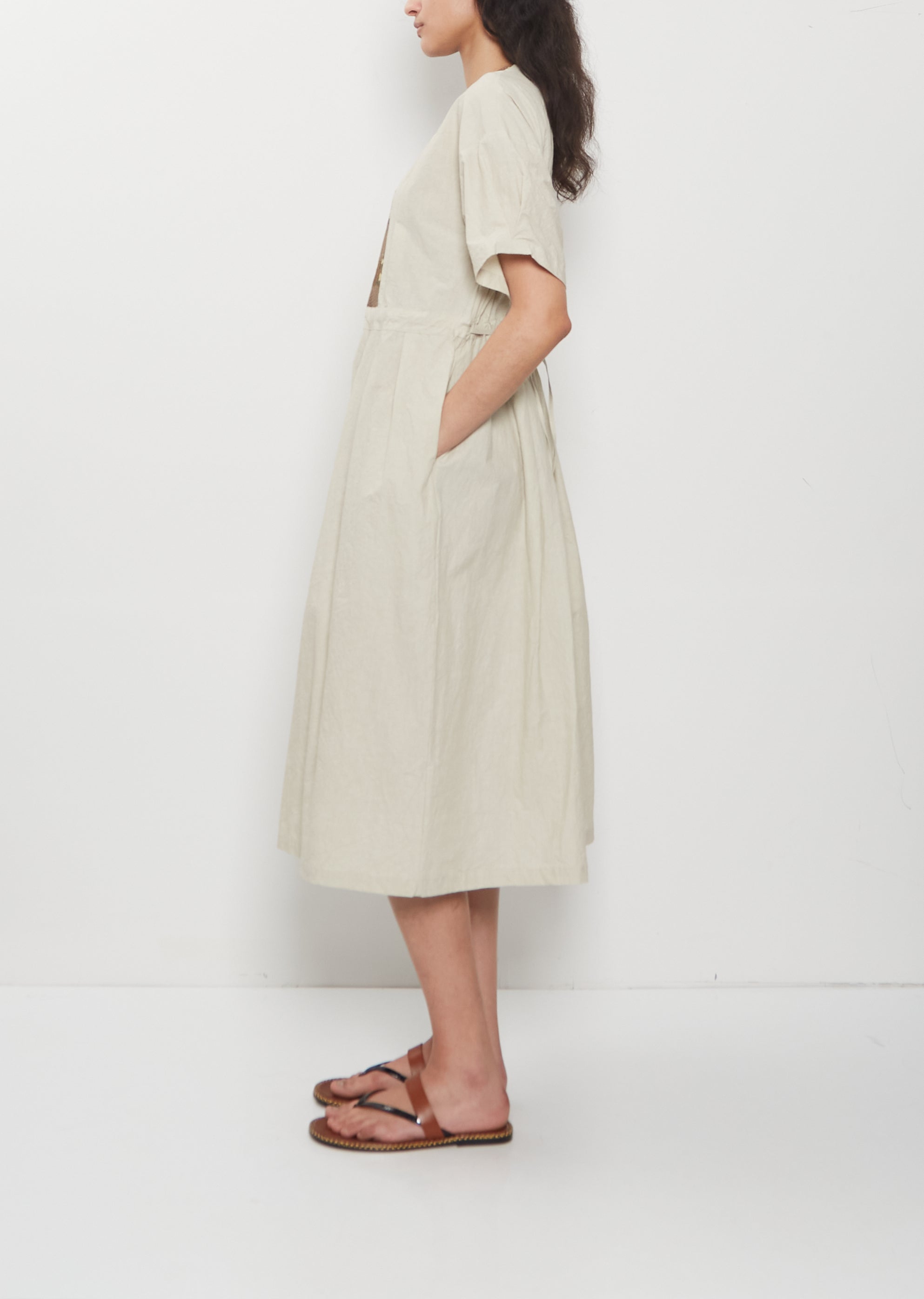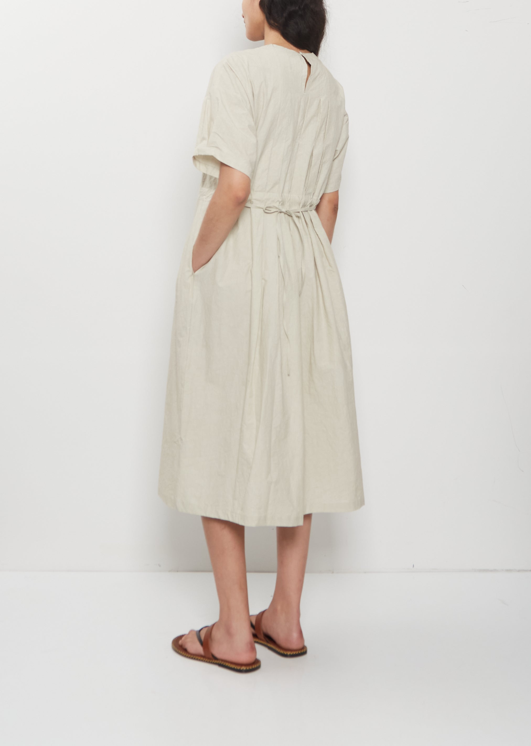 Antipast light sage A-line midi dress with a contrasting front panel crafted from patterned up-cycled socks in a dense cotton. Features a round neckline, pleated details at bodice, short sleeves, a gathered waist with soft pleating through, an optional self tie at waist, and a single button closure at back neck. Relaxed fit.